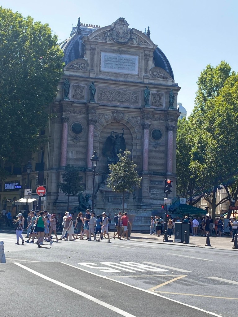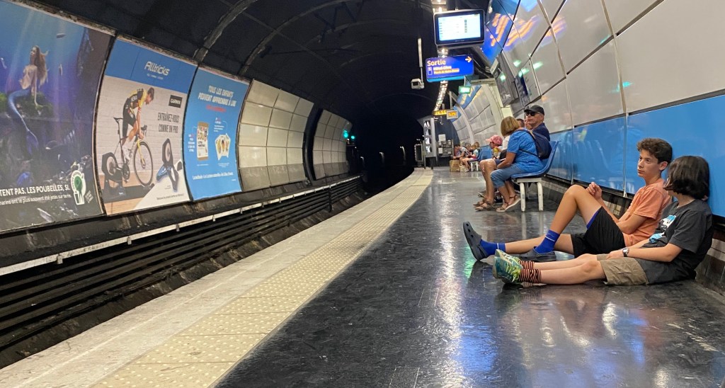 Next luggage, customs, baggage hold, metro tickets and a plan. Enough said, we found all that we needed and headed on our way into Paris for a few hours. Despite exhaustion and the kids not wanting to go, we ventured into the unknown, only following a guide that a friend had sent while in flight on what to do. Mazie became our ticket holder due to her ability to go through customs on her own and having a zipper pocket! The metro was typical except Paris was in a heat wave and must not believe in AIR CONDITIONING, 40 minutes we rode to the St Michel/Notre Dame Stop. Remember the paper fans you made in kindergarten, well we made and used them. I was thankful for my limited metro experiences in DC to help navigate the metro lines. Due to playing SCOTLAND YARD the kids understood reading a metro map as were engaged in the trip.