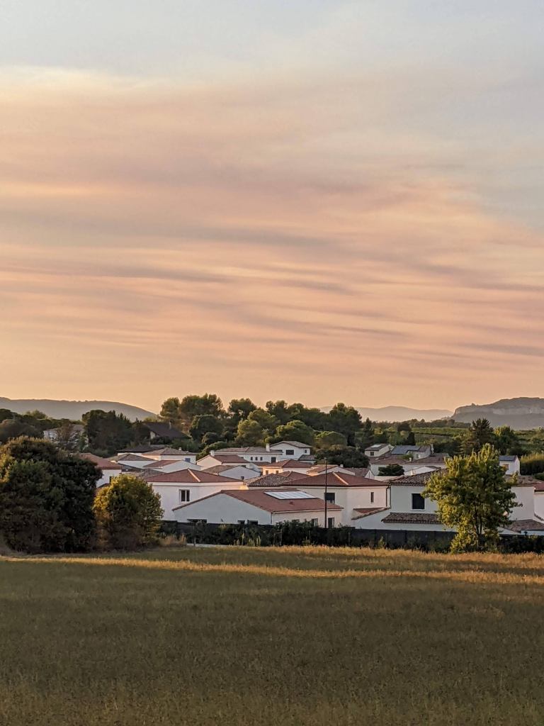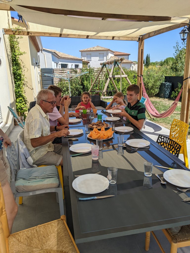 We arrived in Montpellier with our 10 pieces of luggage at 10 pm and were greeted by Amy Labadie…just kidding (for those of you who know Amy). Jill, her identical twin sister, was right at the train door so happy to see us, weary travelers. The final leg was a car ride to our new house in Saint Drezery, France, taking “a little less than half an hour.” We were greeted by Randy (DADDY) and Cody along with Jill’s family.