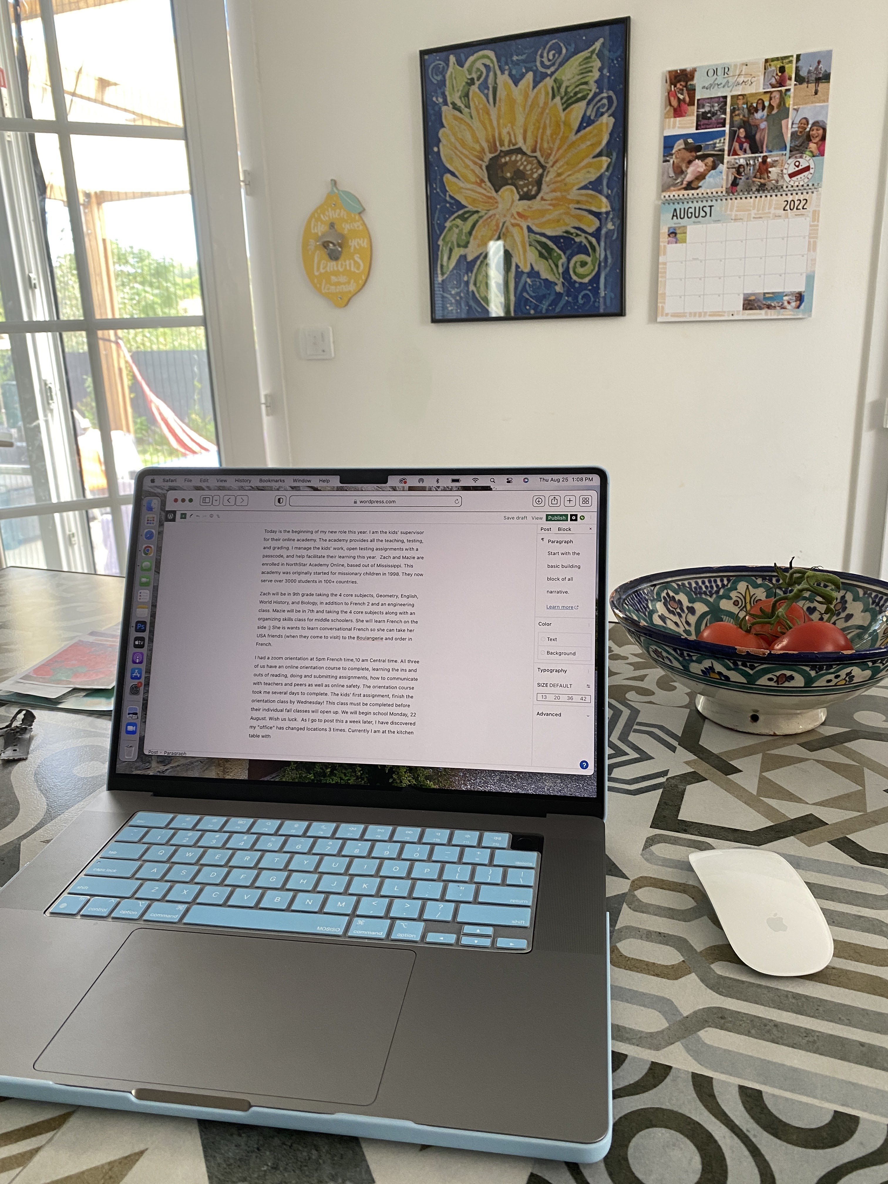 I had a zoom orientation at 5pm French time,10 am Central time. All three of us have an online orientation course to complete, learning the ins and outs of reading, doing and submitting assignments, how to communicate with teachers and peers as well as online safety. The orientation course took me several days to complete. The kids’ first assignment, finish the orientation class by Wednesday! This class must be completed before their individual fall classes will open up. We will begin school Monday, 22 August. Wish us luck.