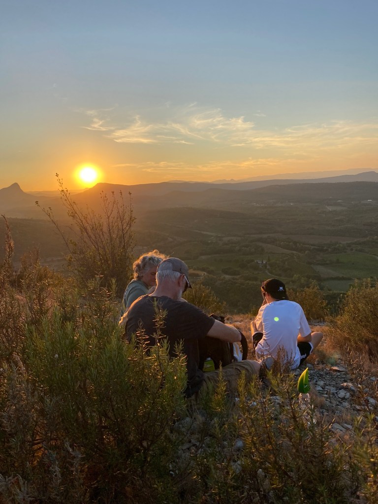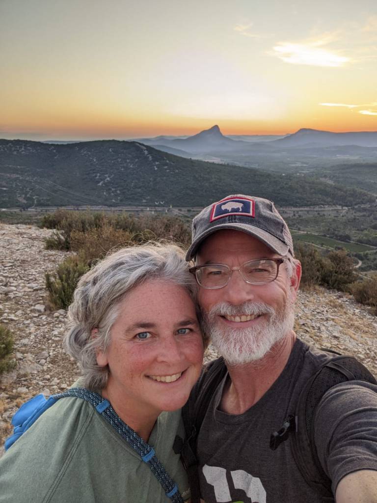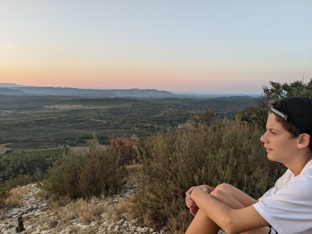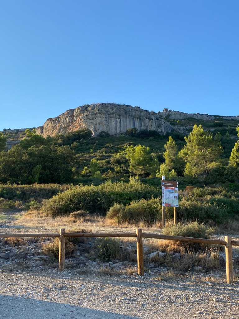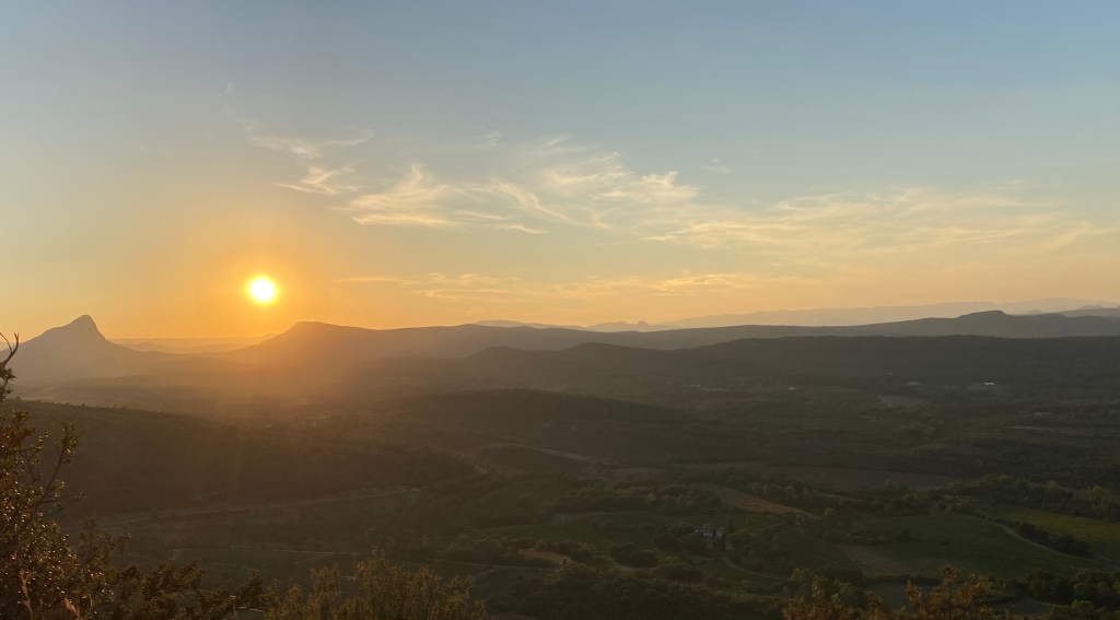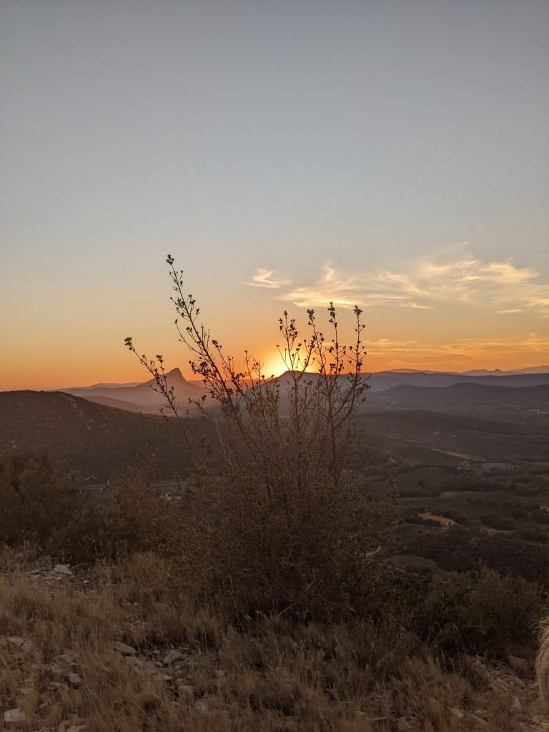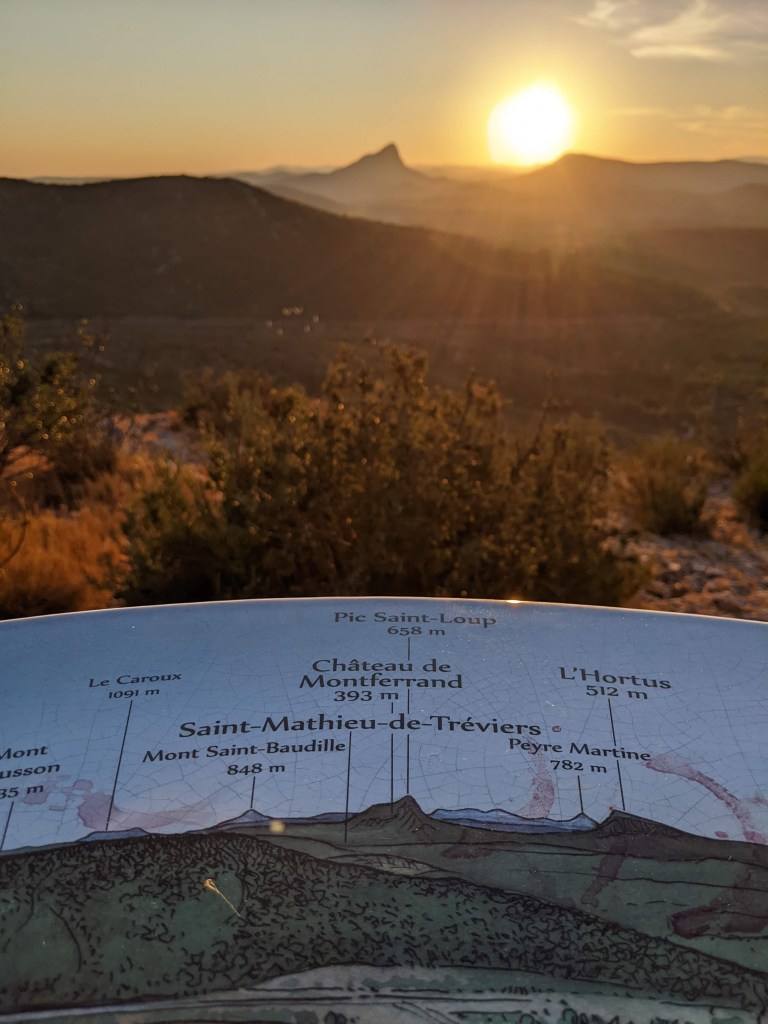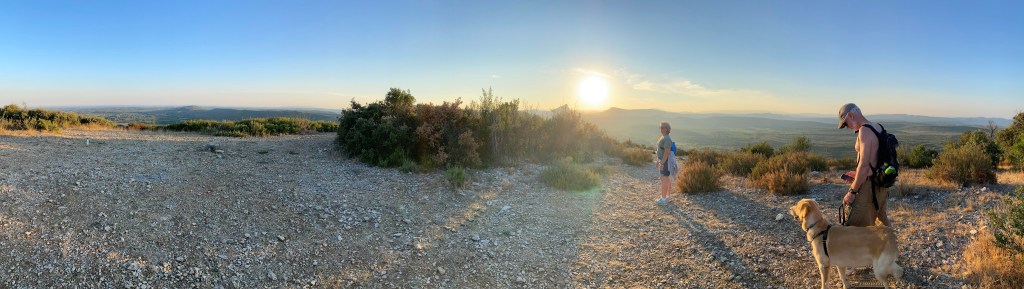 Our weekend ended with a short drive to a hiking place with incredible views Table d’orientation du Puech des Mourgues. One review mentioned a 20 minute hike from the parking lot. Perfect, we thought. Randy made a picnic dinner and we took off, bringing Cody too. Google maps and our understanding of the directions only had us go around a triangular block one extra time. We are getting better!
