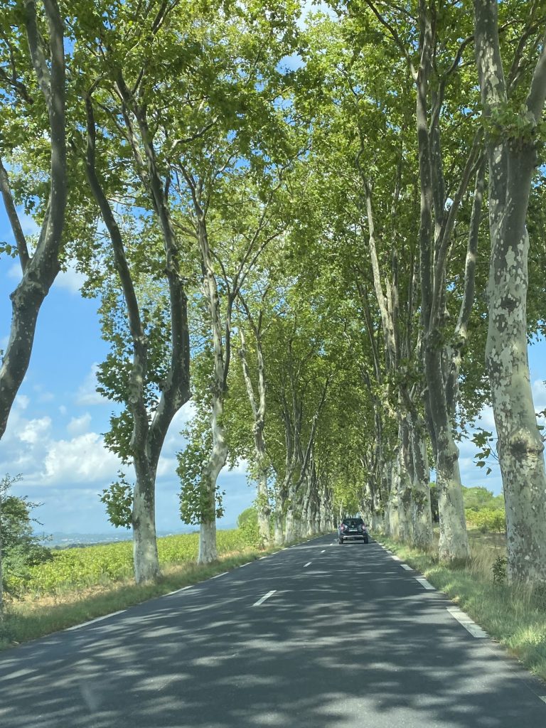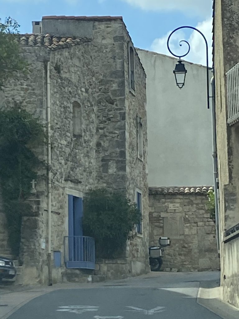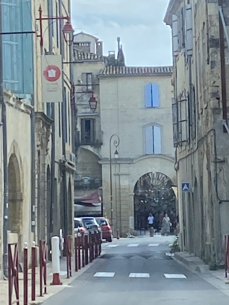 Sommieres has a Saturday market scene, which we will visit another day. Google maps, not Mazie Maps, got us turned around and we ended up in a neighborhood with tiny roads and a barricade at the bottom. My reverse manual driving skills were put to the test, along with tight squeeze driving. The picture does not demonstrate depth nor width well.