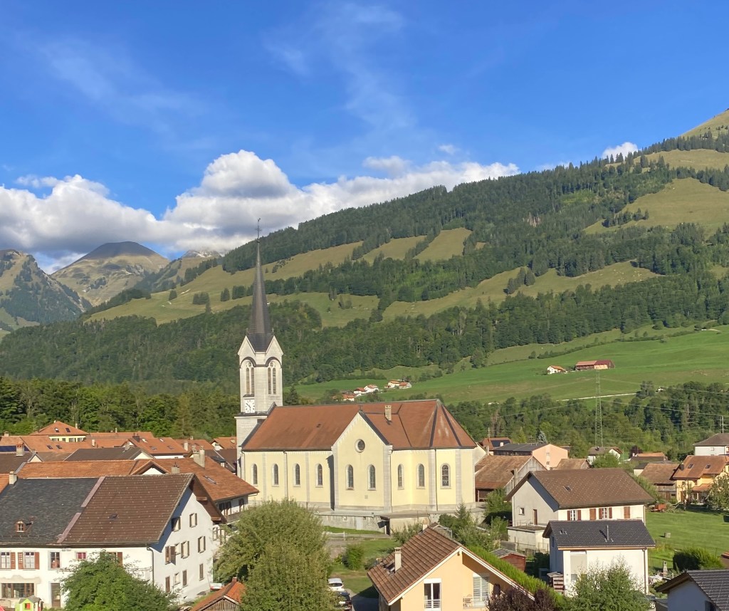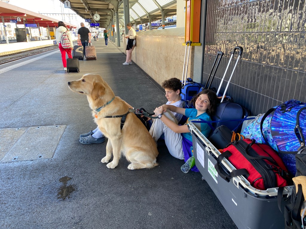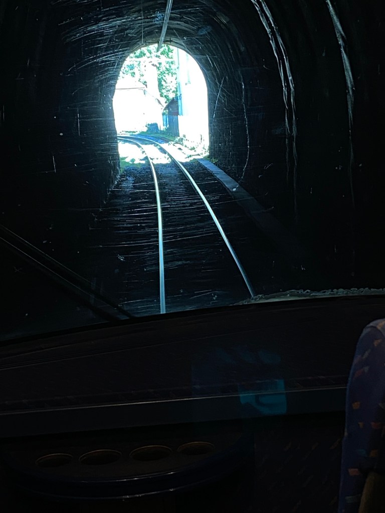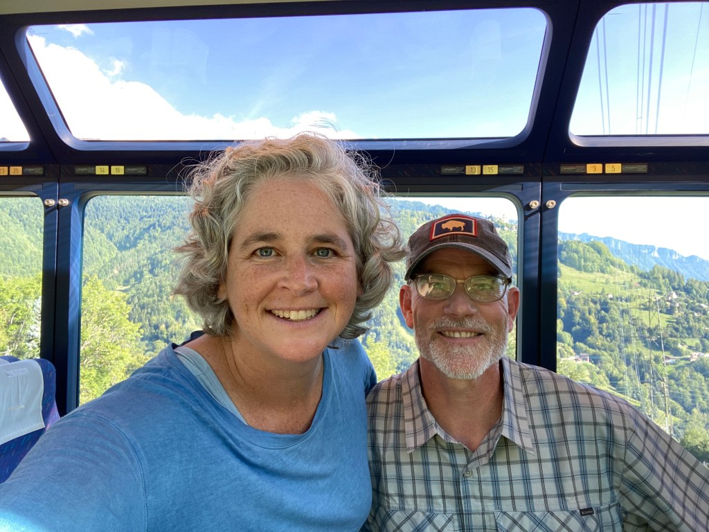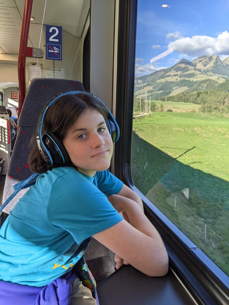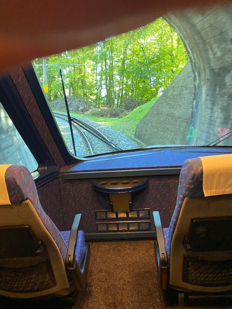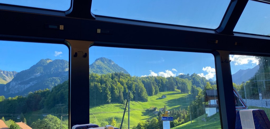 Next our adventure took us on 2 trains and a bus or two, I am losing count. The first train was the Panorama Express with windows on the ceiling. It climbed via switchbacks to Montbovon. Remember in Switzerland there are no assigned seats, or at least we did not ever have any, so I ventured up through several cars to the front as far as I could go, also not realizing it was first class until the conductor mentioned I could stay if I paid. Goodbye, even though it was EMPTY. I did manage to get the family to come experience the views and take pictures before we were caught.