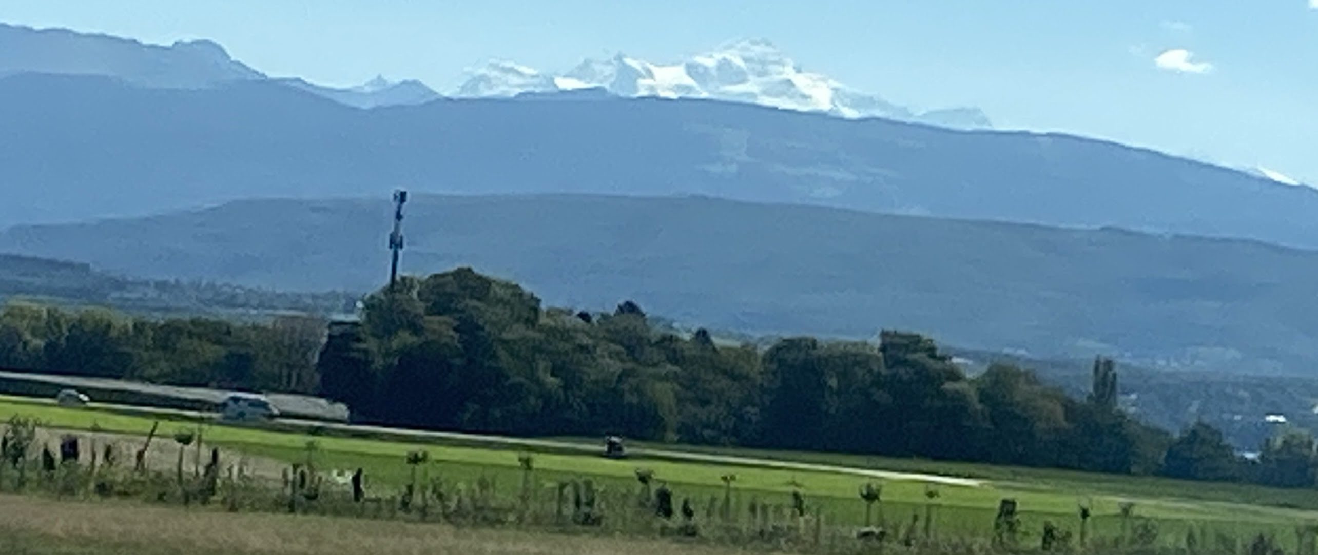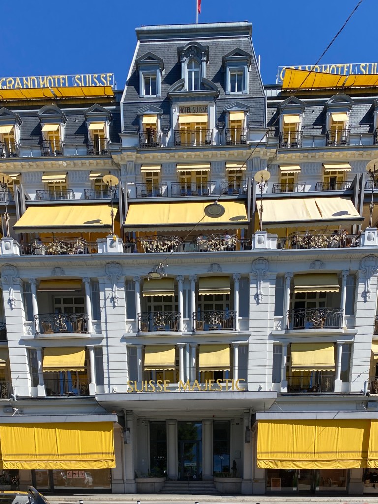 Since we had seen most of the things on our Geneva list last night we decided to sleep in, eat breakfast at the hotel, and continue on our way by catching a bus (with all of our stuff) and then a couple of trains. The landscape went from city, to mountains, even snowcapped mountains in the distance, to turquoise lakes lapping along the banks of the rails. The Grand Hotel Suisse overlooked the city park.