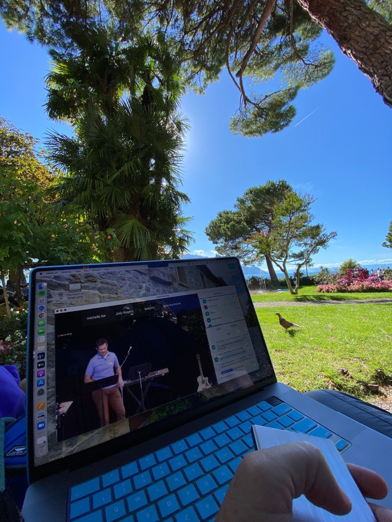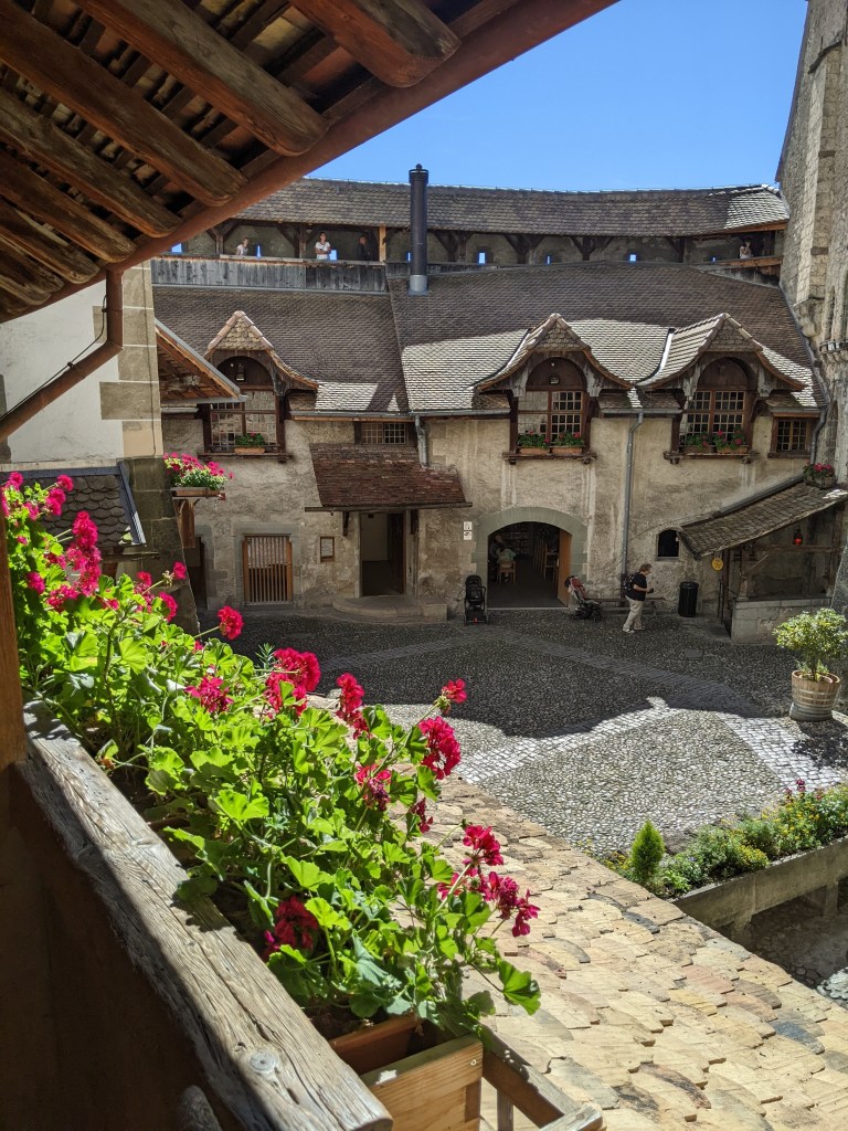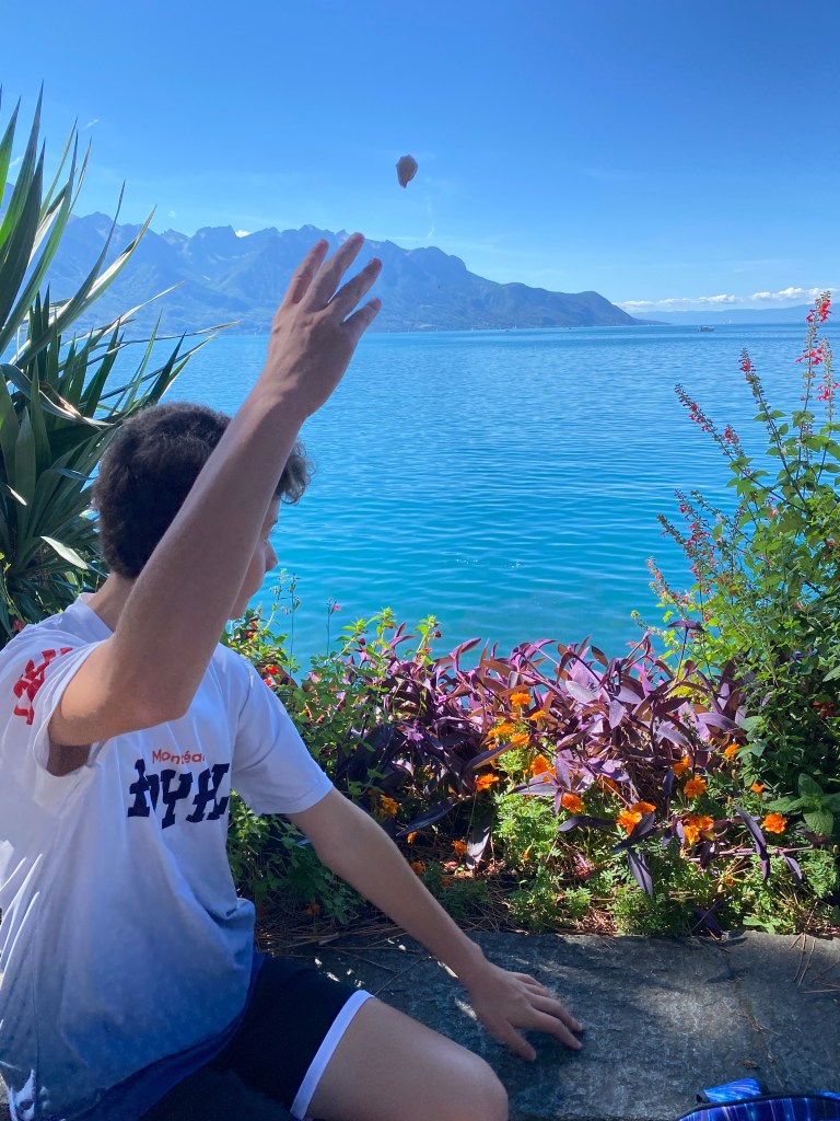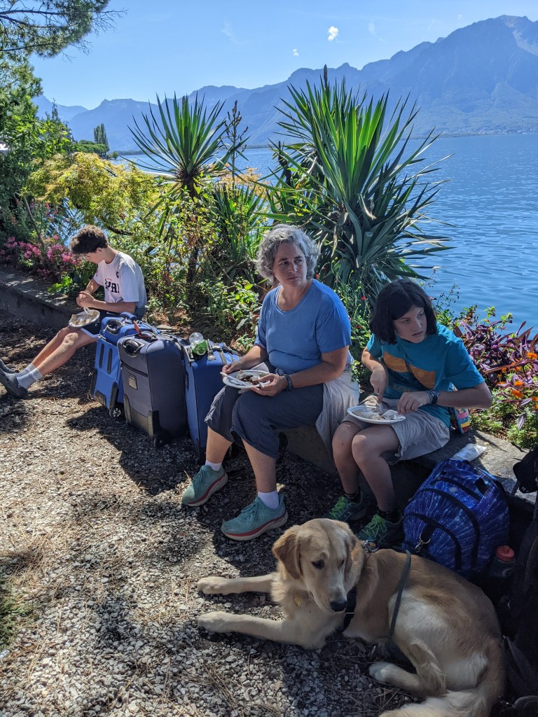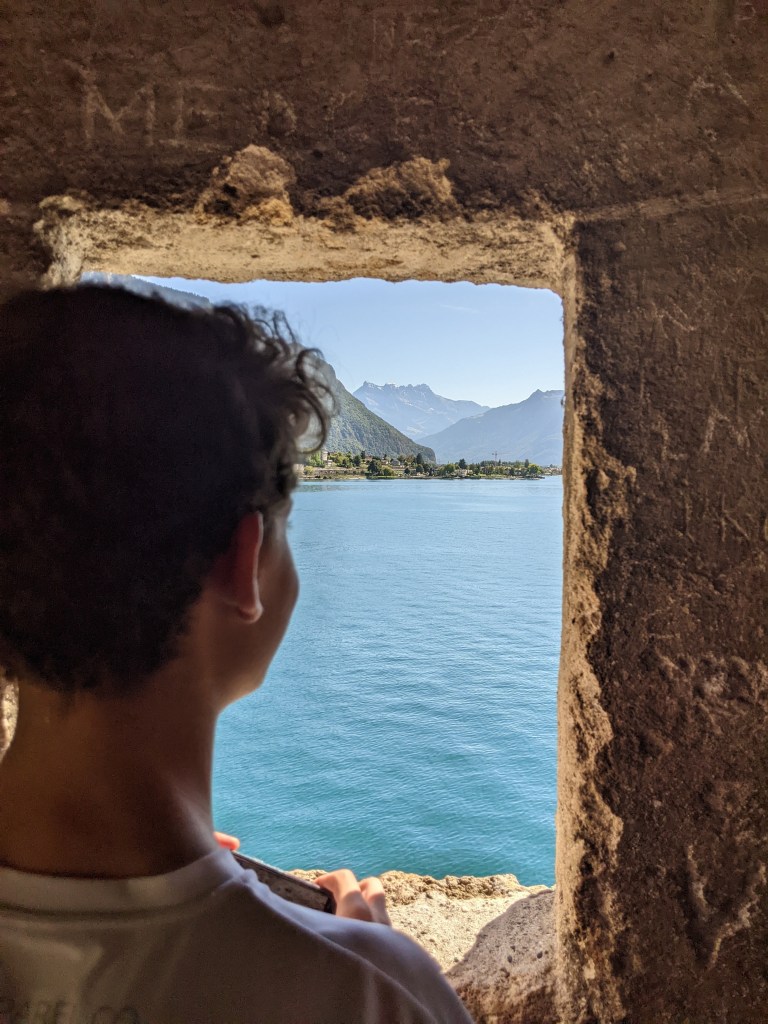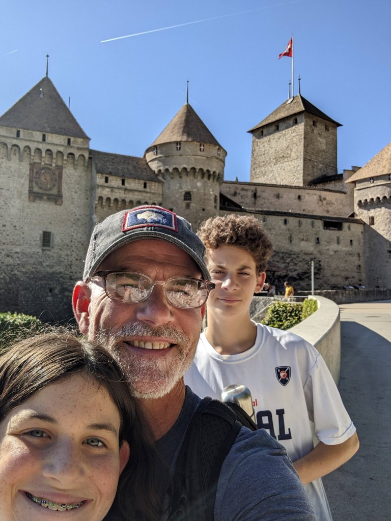 Randy and the kids hopped, well, literally jumped on a ferry to visit the Chillon Castle. Cody and I walked the park, chased pigeons, played in a water fountain and joined church back home via zoom.