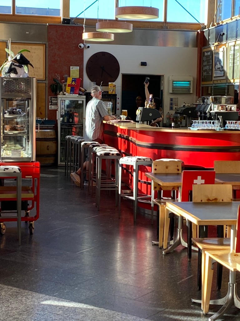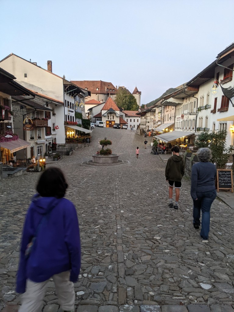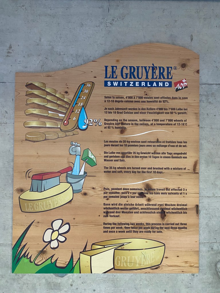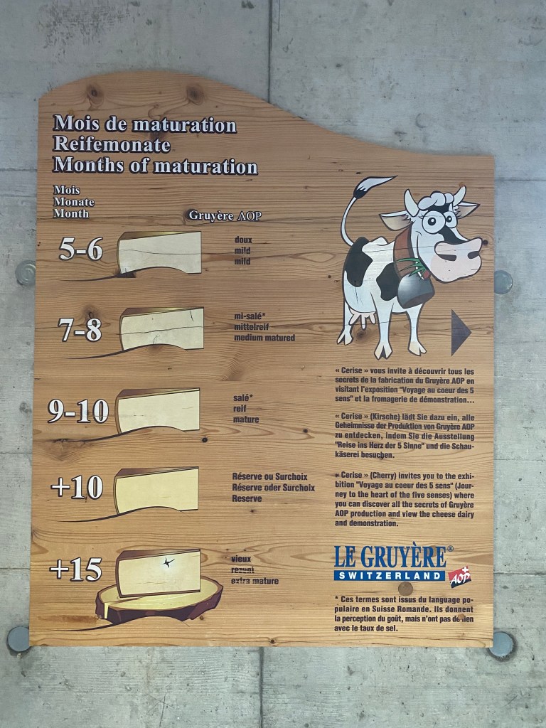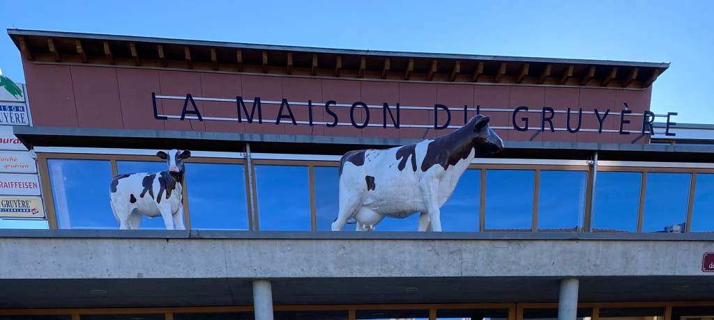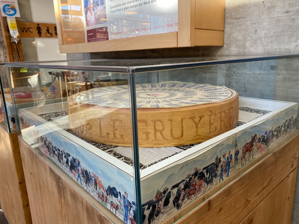 Another train took us even higher to Gruyeres. While waiting for our last bus to take us up the mountain side to our hotel and the small medieval village of Gruyeres, we explored the cheese station. The wheels of cheese reminded me of the “Hot Now” donuts at Krispy Kreme.