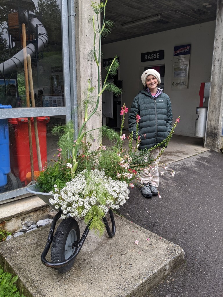 We did the cliff walk in Birg, except I did not complete it. The height got to me, especially as I saw the kids walk a tightrope over the open air, granted they were completely safe with fencing and cables. Still, I returned to the deck and found flowers clinging onto the mountain side…probably hanging on for dear life too!