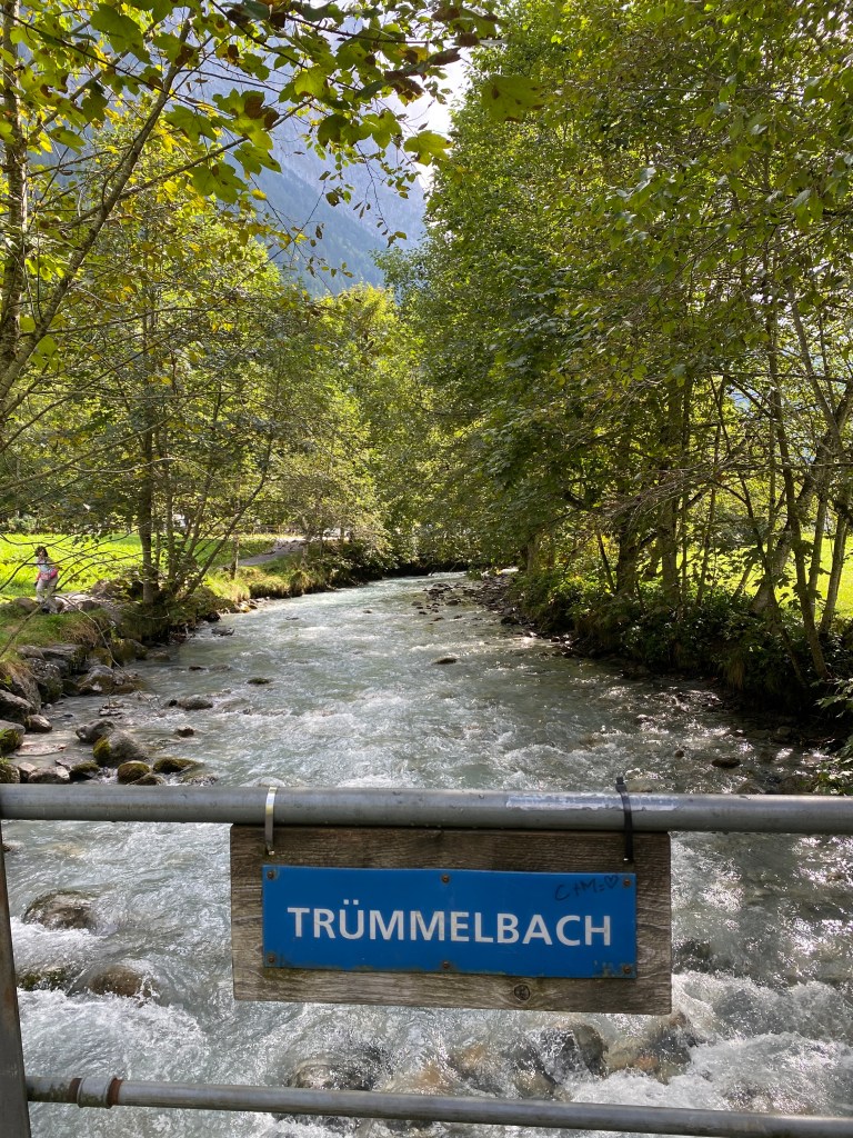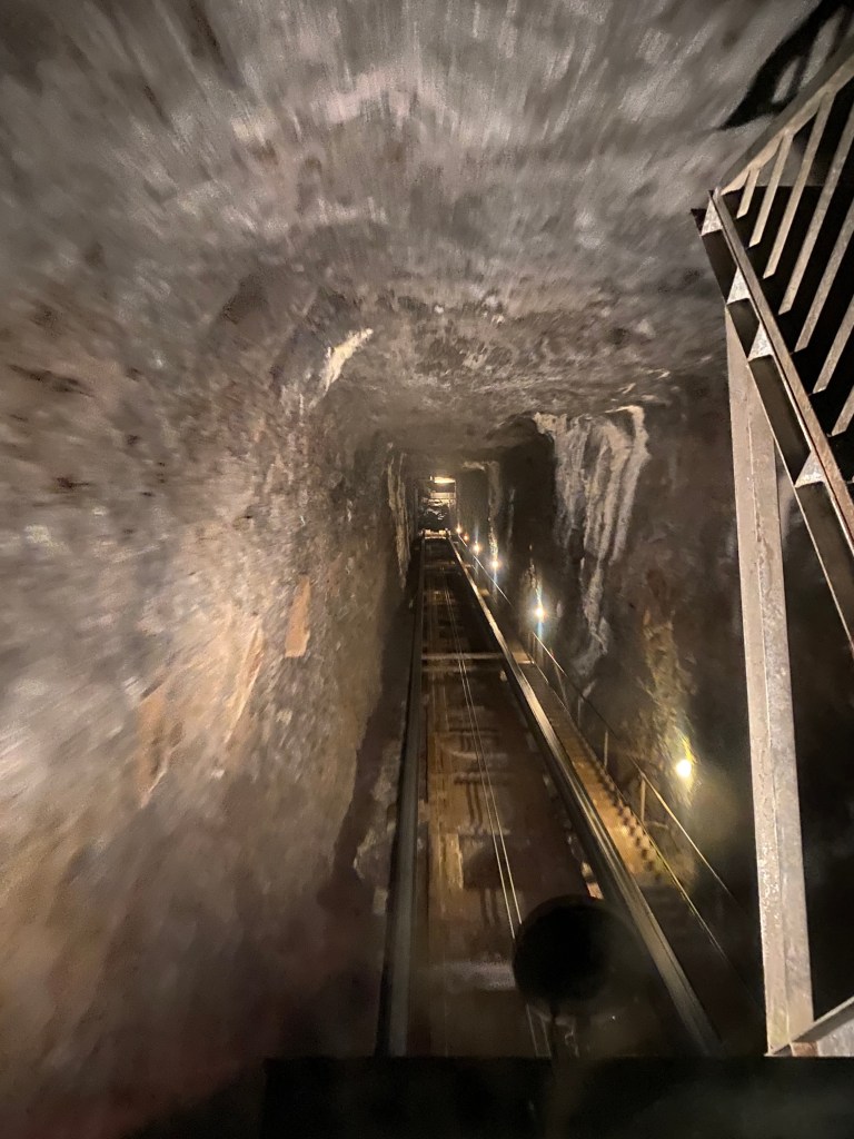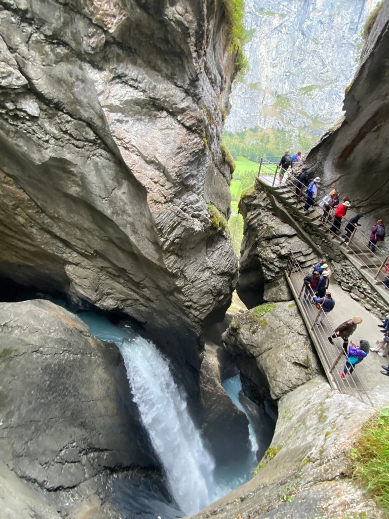 Trummelbach is a spiral waterfall through the mountain like a vertical slot canyon. An internal ride takes you to the 6th level of the falls. Once you exit the ride you can walk 4 levels up and then descend all the all back down. There are 10 levels of waterfall viewing. M and Randy are leaving the observation area on the top of the steps heading right around the outside of the mountain. Only Trümmelbach drains the huge glaciers of Eiger (3970m), Mönch (4099m) and Jungfrau (4158m) with up to 20,000 liters of water per second.