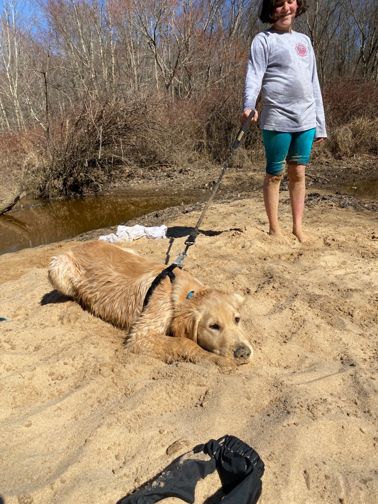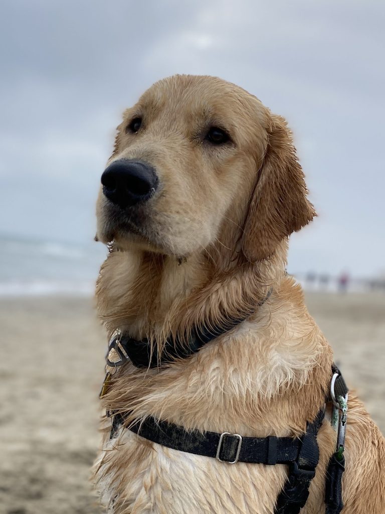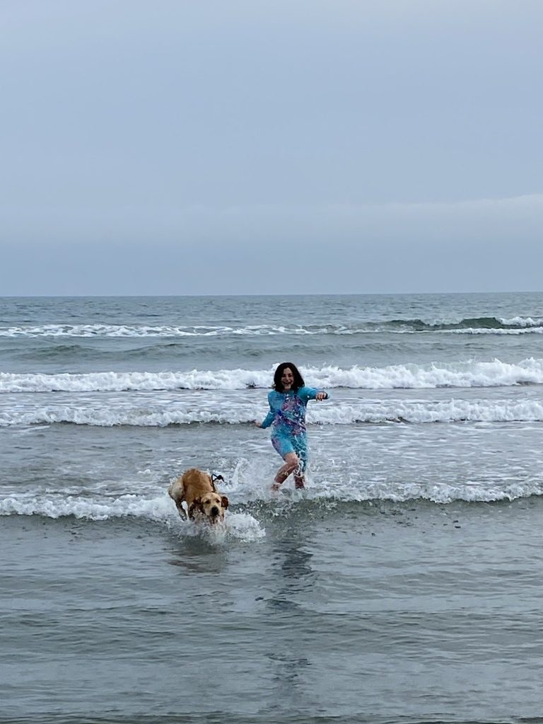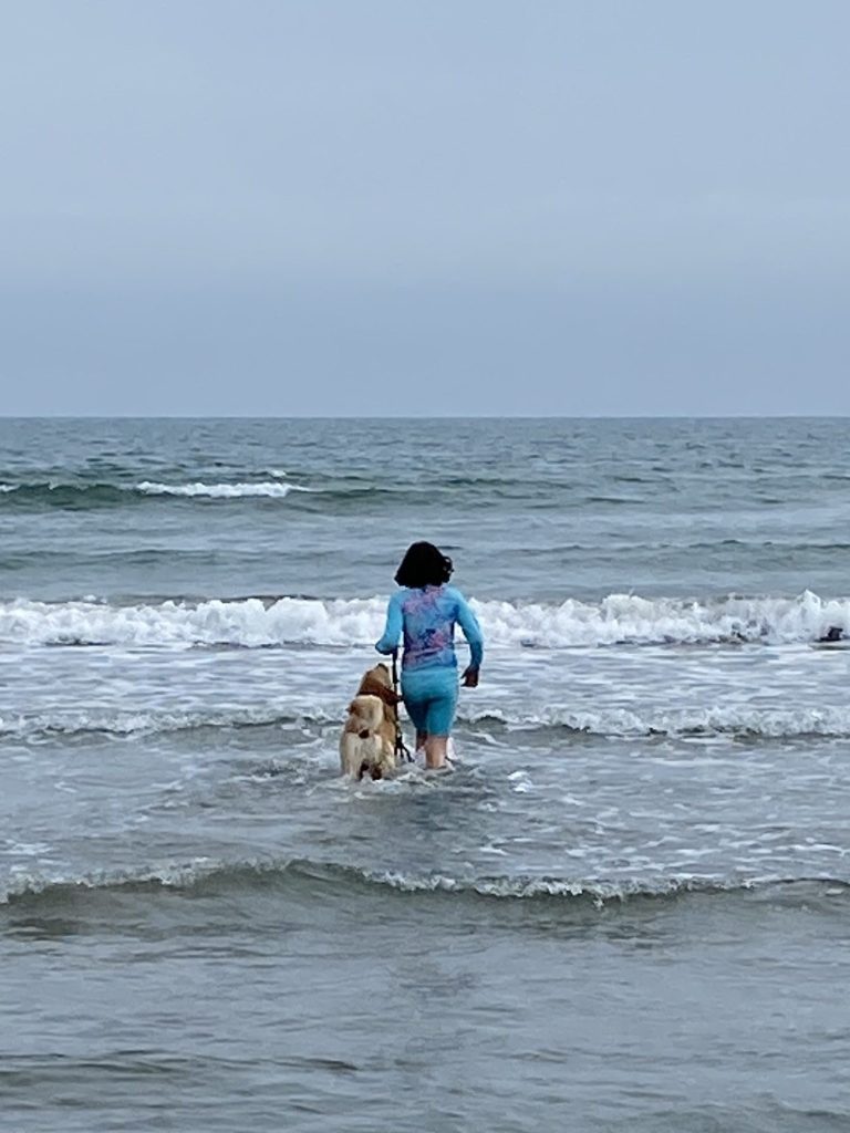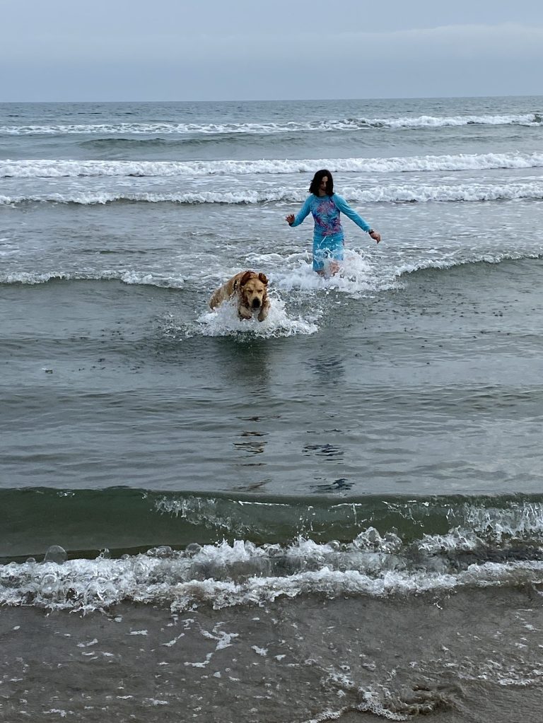 M, his best friend, decided to surprise him with his first trip to the beach. He bounded in right after her and loved it. One time a little wave caught him off guard and he was afraid and done. I think he did not like salt water in his nose. After several attempts to reintroduce him to the sea he reluctantly went back chasing M, forgetting about the mini wave that caused him so much anguish.