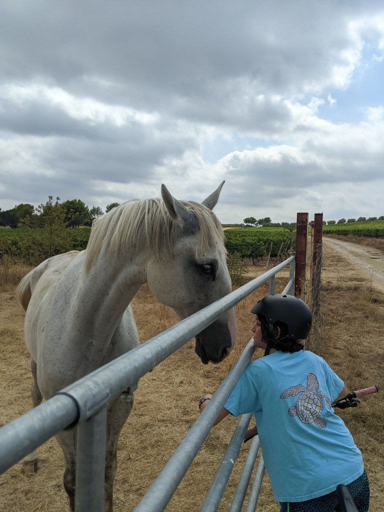 “I’ll be back,” is often the phrase we hear a couple times a day. Mz and Cody bike and run 2x daily. Sometimes through the surrounding vineyards, through the village to a creek, around the nature walk, to the boulangerie or through the neighborhood. More frequently they just take off without a destination and let the roads guide them. When one of us tags along, we experience life as the youngest ones in the family do. Mountain biking has become a new place of enjoyment for Mz. She relishes in the freedom, open fields, narrow paths, the independence, and determination to keep them both safe.