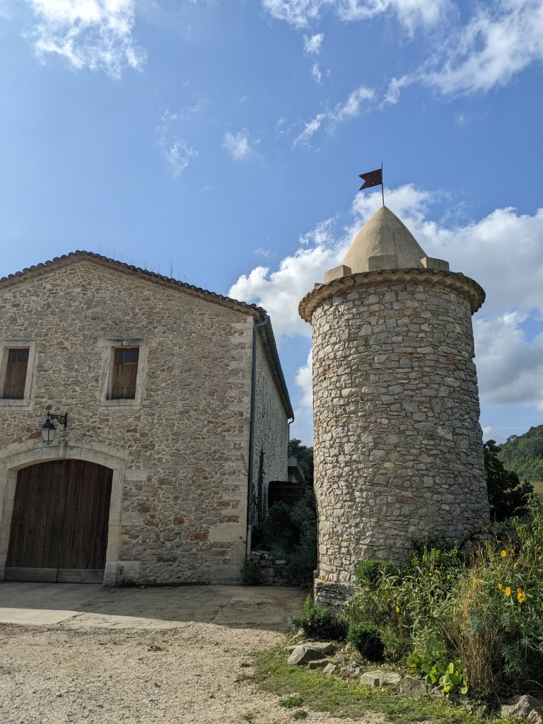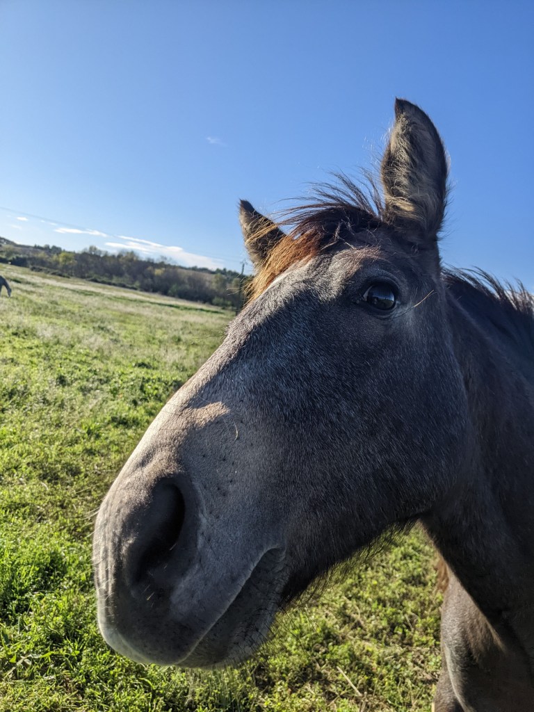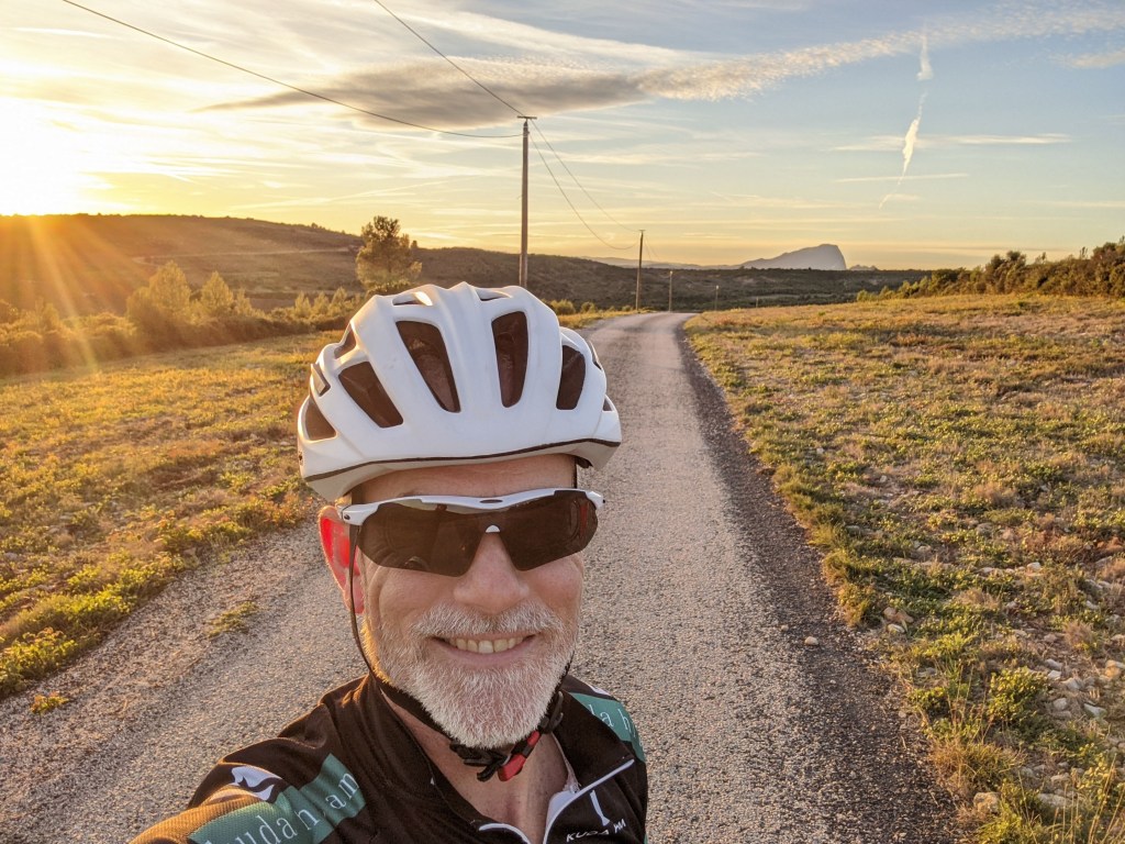 A couple times a week, Randy takes to biking the countryside surrounding the neighboring villages. Mainly car-free roads, tree-filled plains stretching to the not-so-distant mountains. Horses, in their fields, running alongside him. Wineries beckoning for return visits. Local café servers recounting the days when the Tour De France would ride by and sharing their own stories of being professional riders. Occasionally, he meets other riders and they chat in French about life. The guy below and his dog were traveling Europe and Africa. Apps like Kamoot and Strava record and keep an eye on Randy’s destinations for both of us.