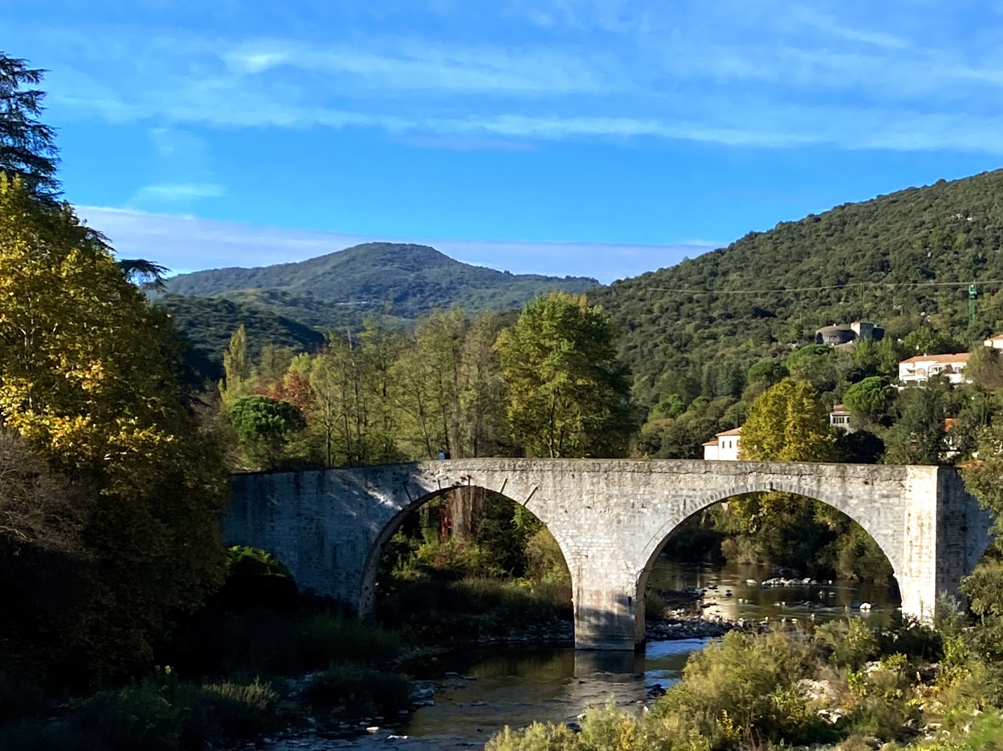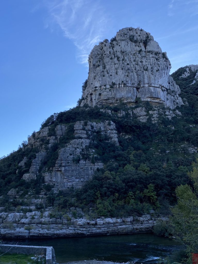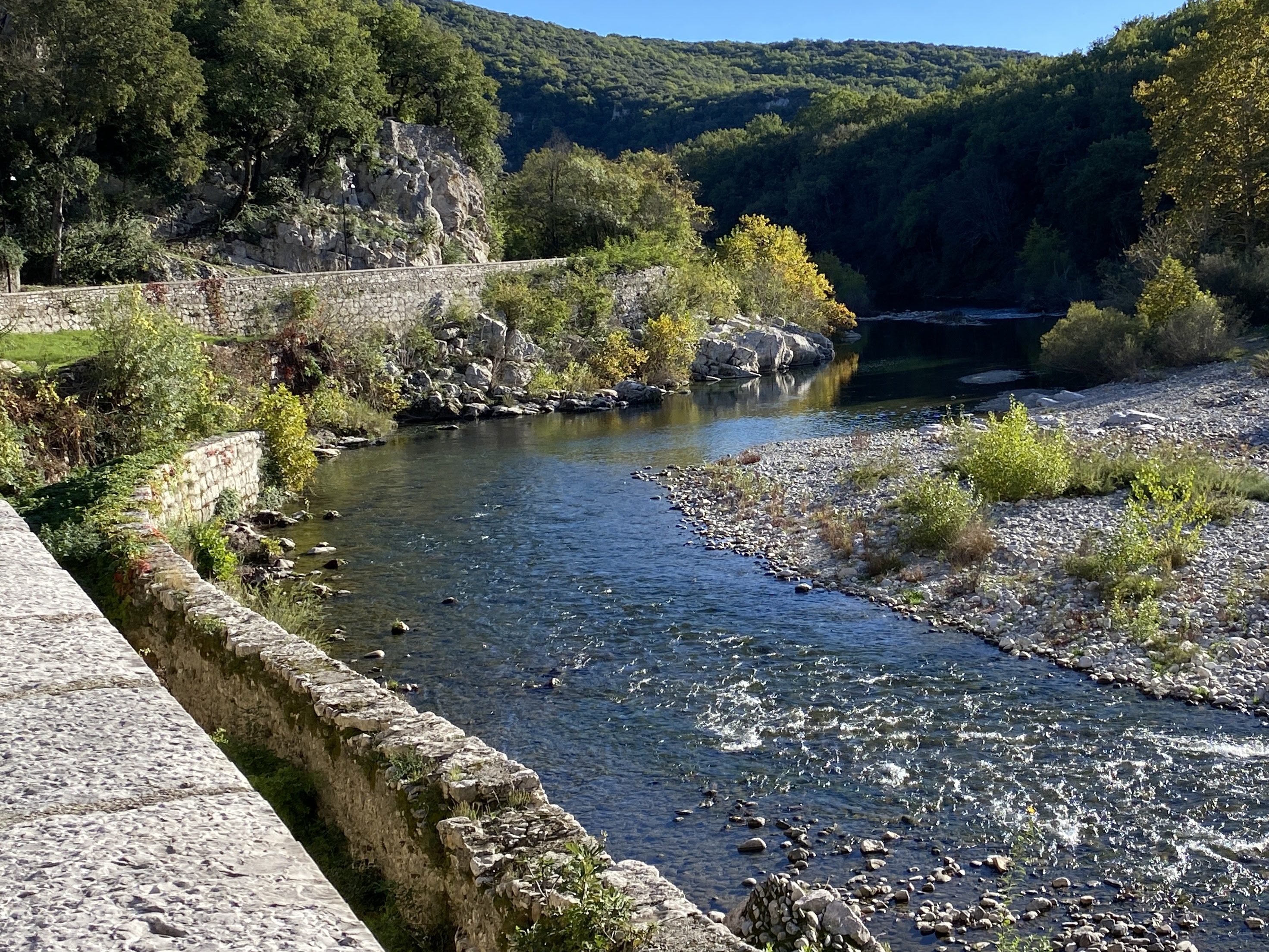 Just what I needed on a fall day, crisp blue skies, yellow foliage, curvy mountain roads following a meandering river, familiar music to sing to. I drove NW toward Ganges, out of Herault into the Gard district. Here I found La Cascade de la Vis.