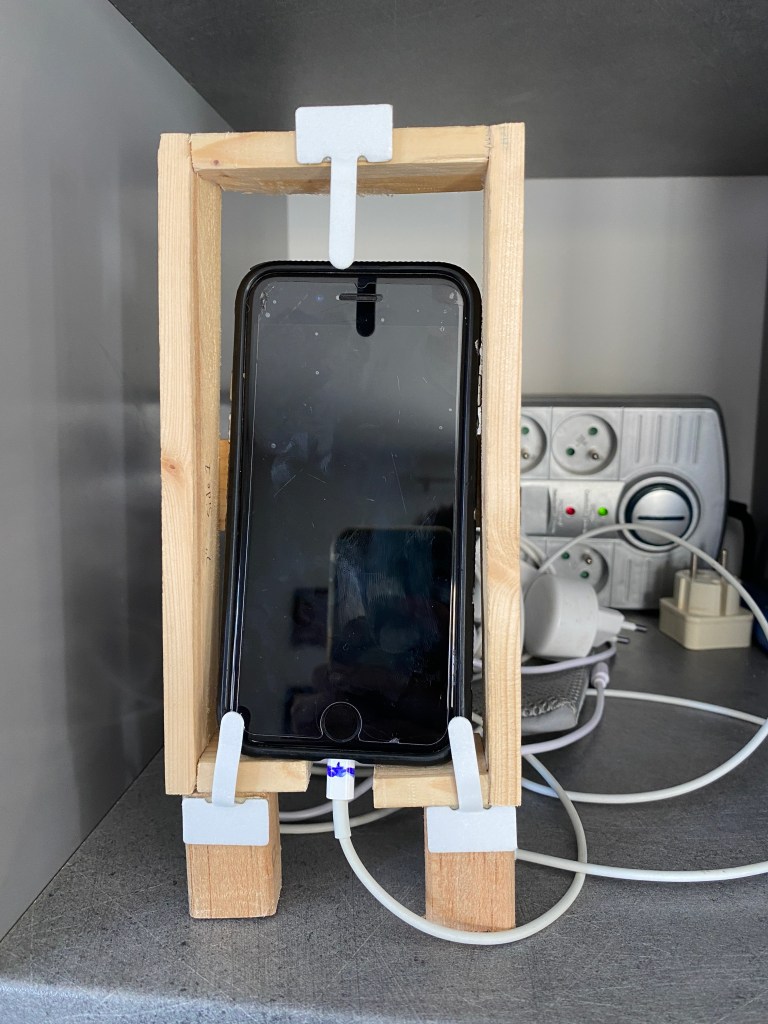 School work is often done in pjs and with Cody. Z’s unique design project, a cell phone charging holder, was an engineering project this month.