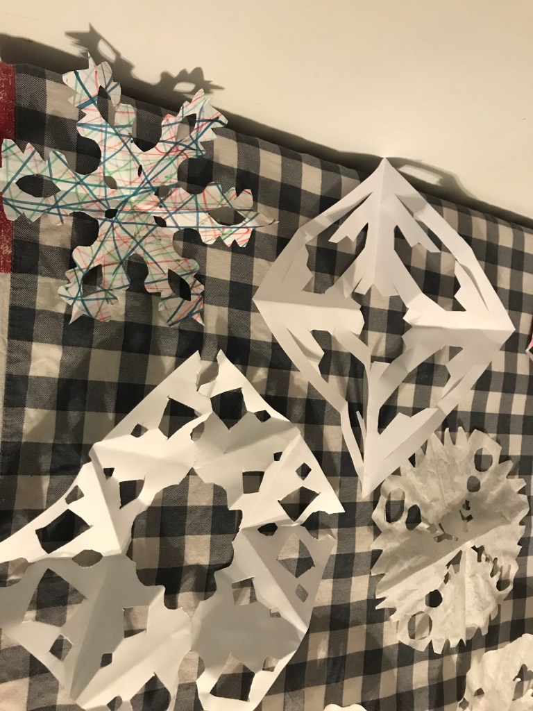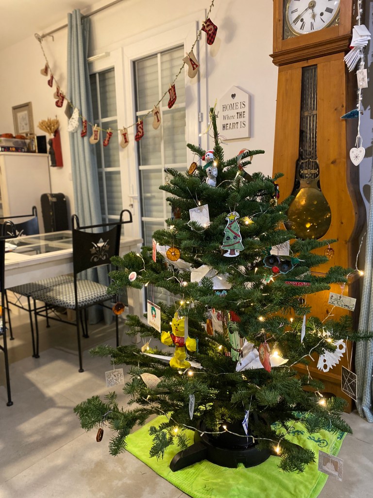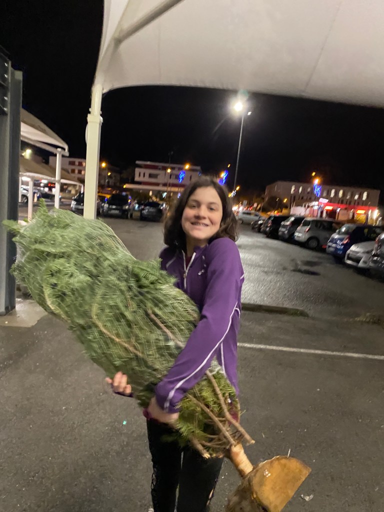This year neither our family nor the Ferrieu family thought about being away from our houses over the holidays. We decided to make the most of it. Mazie picked out our tree, something different than normal, yet perfect (makes the presents seem more when the tree is small). I ordered one thing from Amazon France. We started making our own ornaments out of anything we could find. Sliced and dried oranges, egg carton creations, cut out snowflakes, images from food boxes, hot cocoa packets tied up with string, these are a few of our tree decorations.