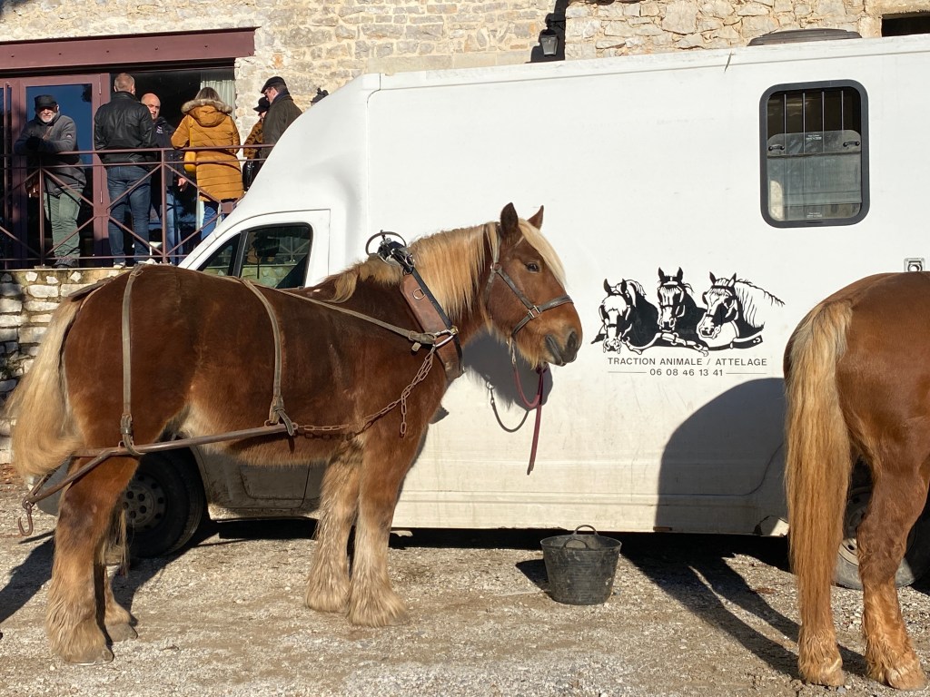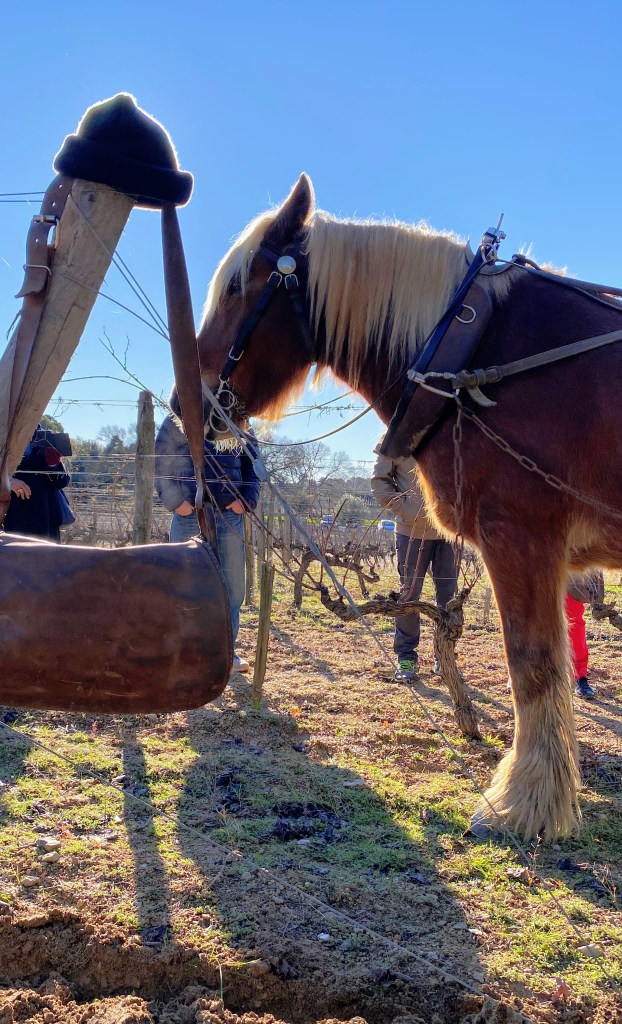 We were reminded this month during church that when Jesus was born it was a typical normal day for everyone else. Shepherds were watching their sheep, bakers were baking, farmers were preparing or harvesting the land, children were playing, and some people were traveling. In the morning at the chateau we learned how horses plow the vineyards. The farmer spoke in French and Randy translated important details for us. I was interested in seeing how the farmer was connected to both the plow and horse by a lengthy leather belt. Not sure why the donkey was present but she was everywhere, maybe someone’s pet, maybe for show, maybe just because. We talked about how some breeds have a cross on their back.