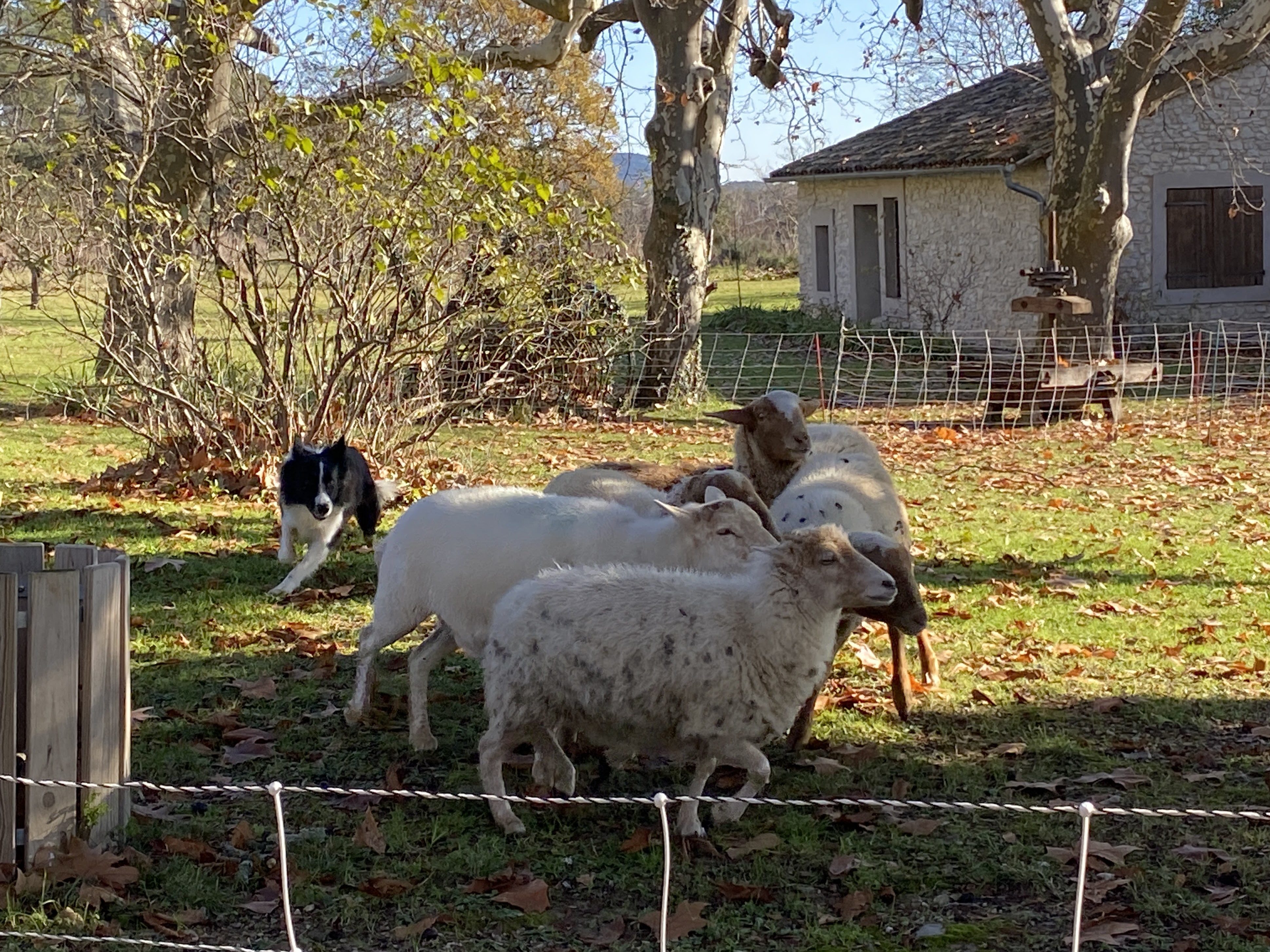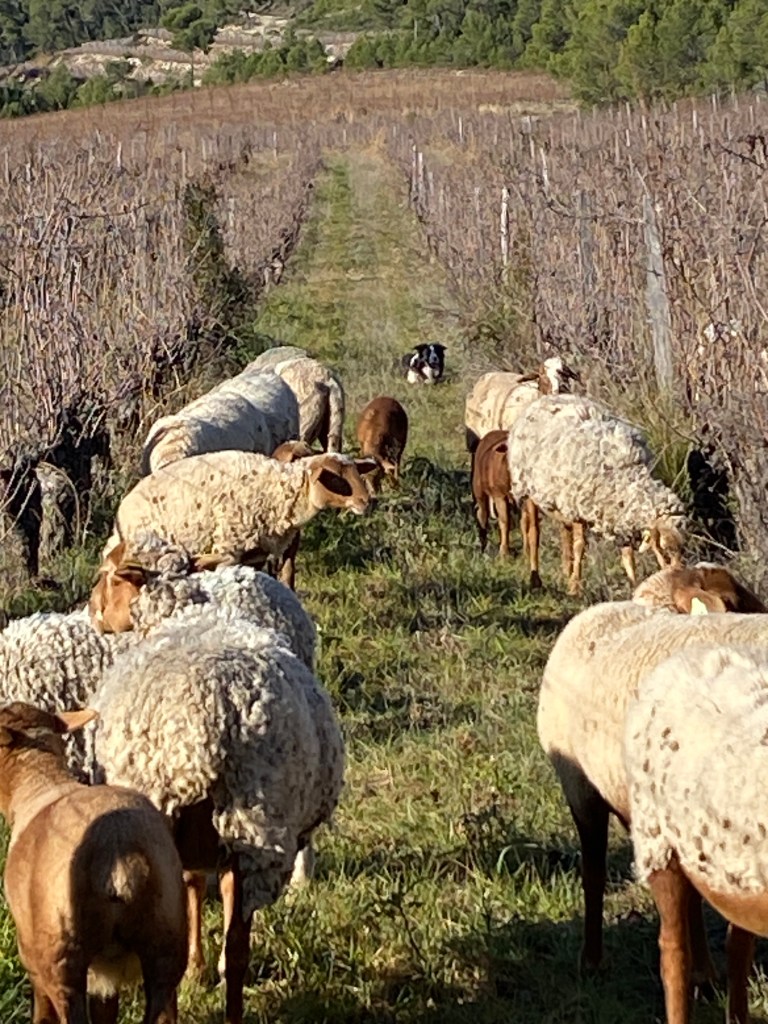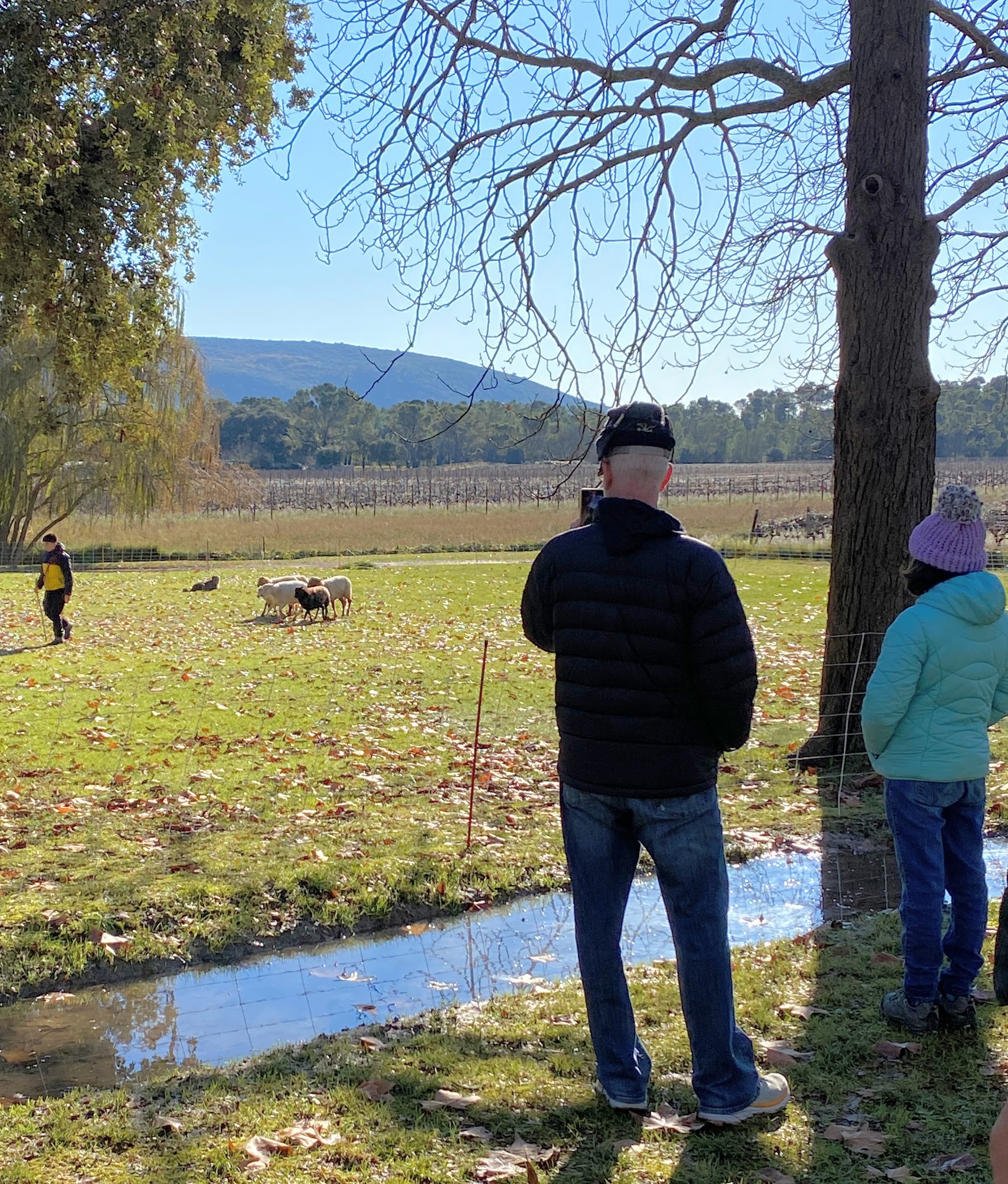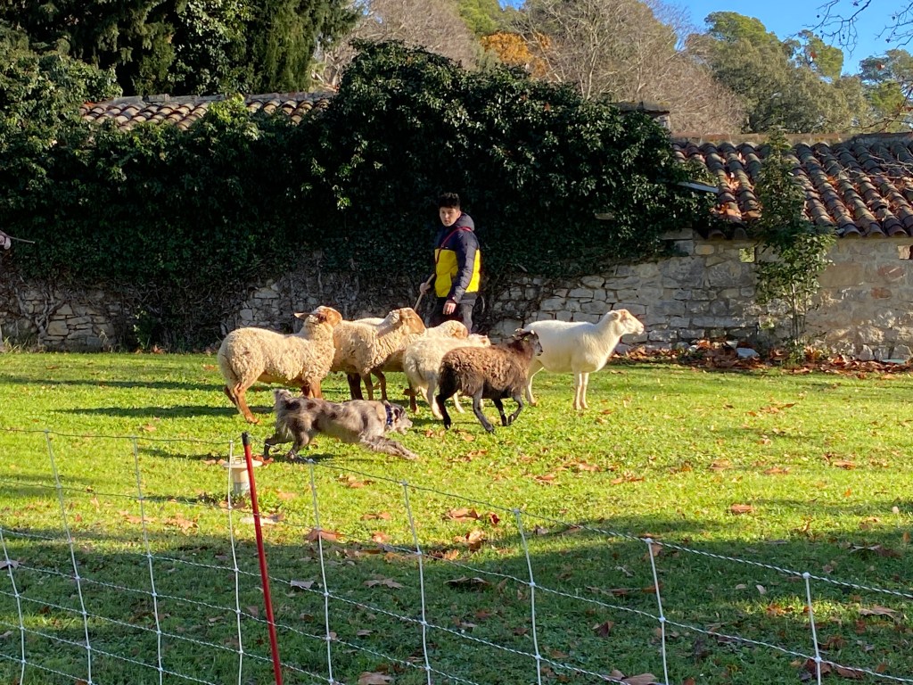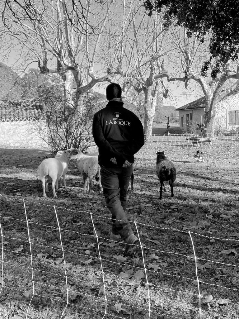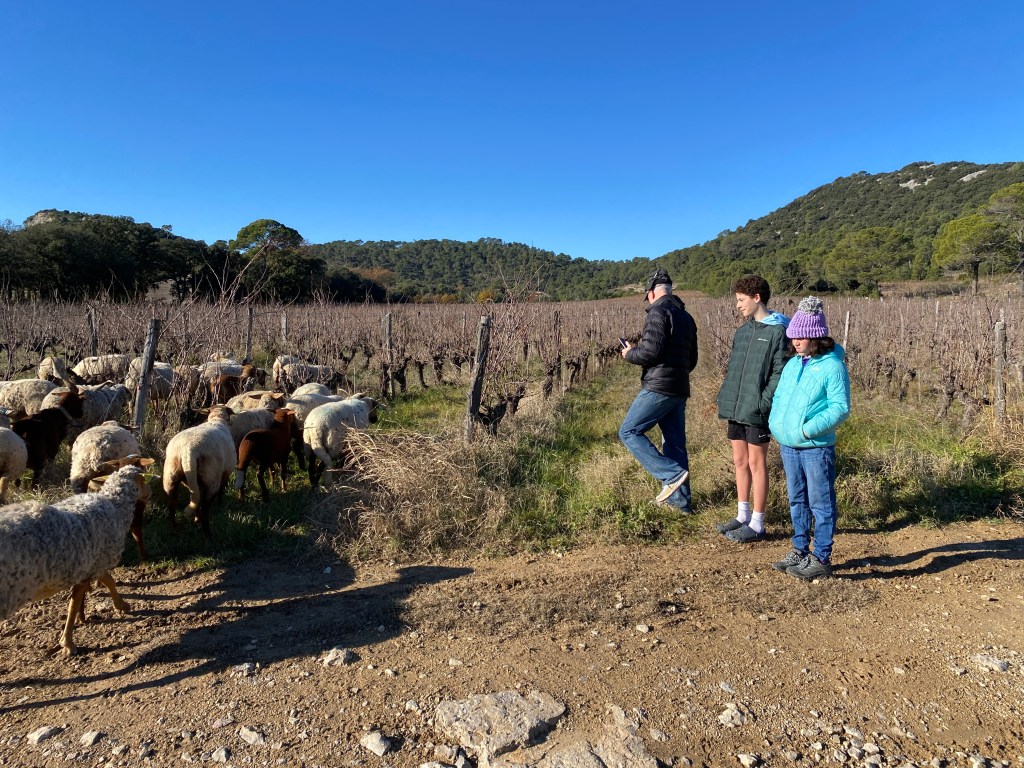 Bike riding is not a typical image I think about in winter. A shiny bike by a Christmas tree however can be a solid image and hope for many. Randy and his road bike take to the road a couple times a week. A few months ago a ride led him to Château La Roque, cru Pic Saint-Loup. (I blogged about this under November VII.) Upon researching events for our family to attend nearby he found an invitation for December, at the chateau. A French field trip for our entire family accompanied with wine, good food, horses, dogs and sheep!! A win win for all of us.