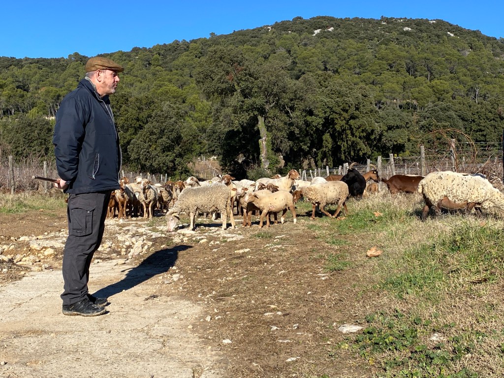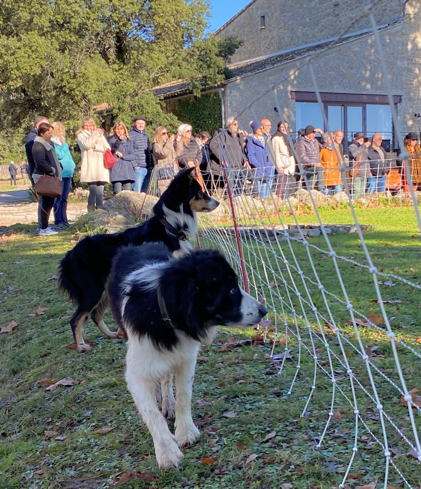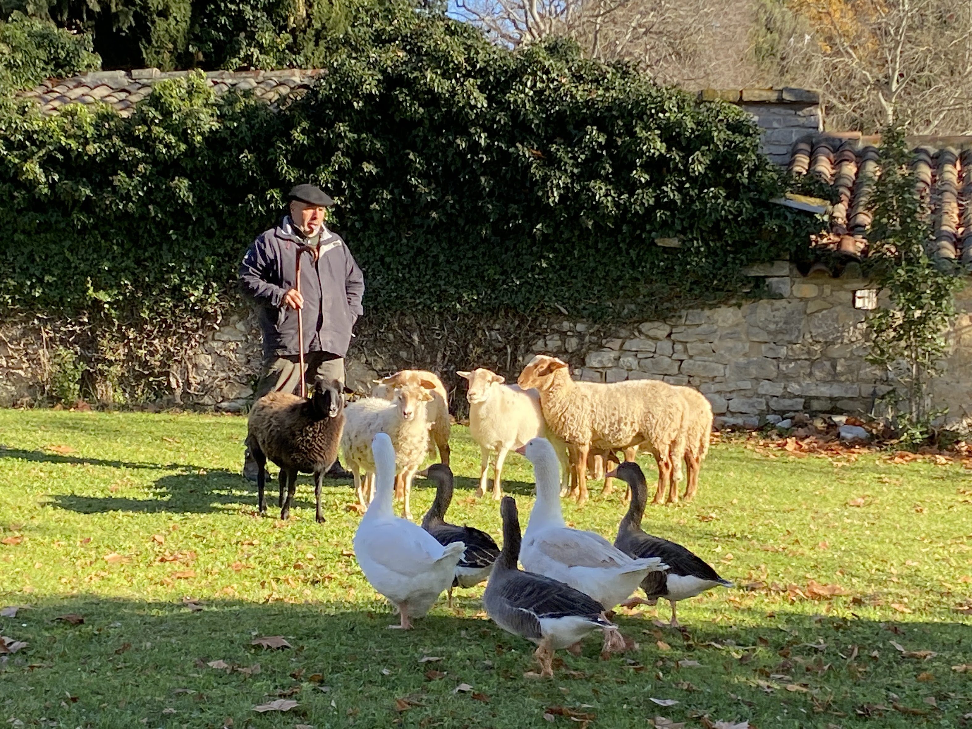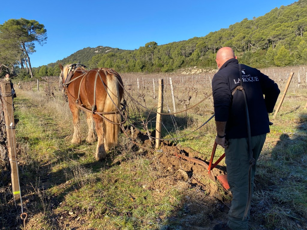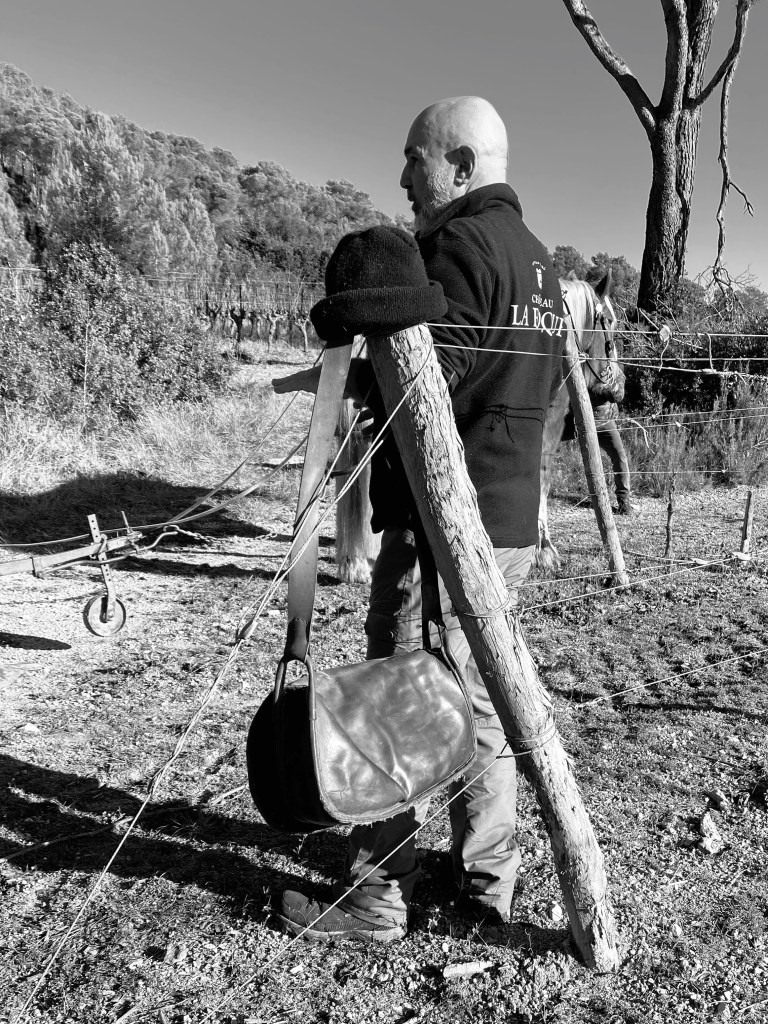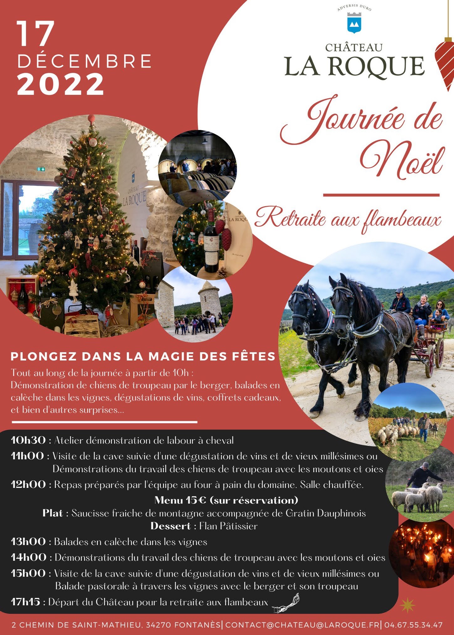 Bike riding is not a typical image I think about in winter. A shiny bike by a Christmas tree however can be a solid image and hope for many. Randy and his road bike take to the road a couple times a week. A few months ago a ride led him to Château La Roque, cru Pic Saint-Loup. (I blogged about this under November VII.) Upon researching events for our family to attend nearby he found an invitation for December, at the chateau. A French field trip for our entire family accompanied with wine, good food, horses, dogs and sheep!! A win win for all of us.