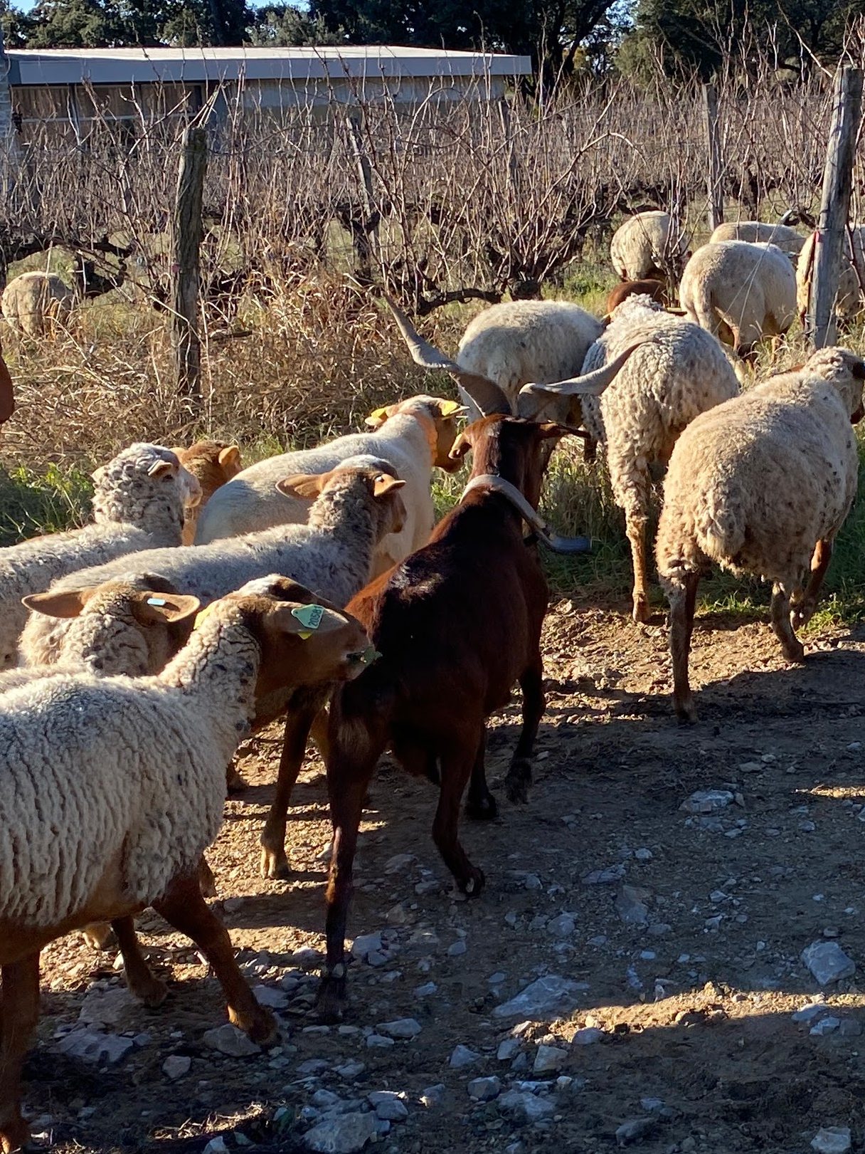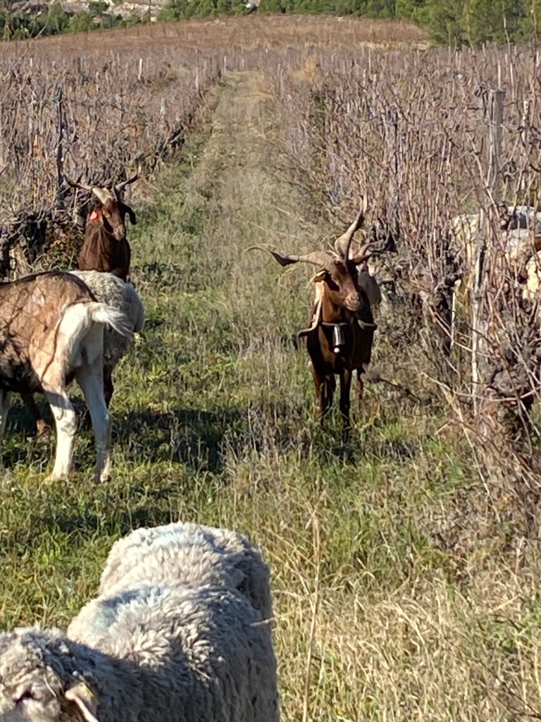 After the plowing session we spied sheep and goats in the vineyard. A watchful dog kept the animals in place, occasionally running to one side or another when part of the herd started veering off. A shepherd communicated to the watchdog using different whistle sounds. We watched in fascination with joy on our faces. The goats with their crazy horns reminded me of miniature reindeer.