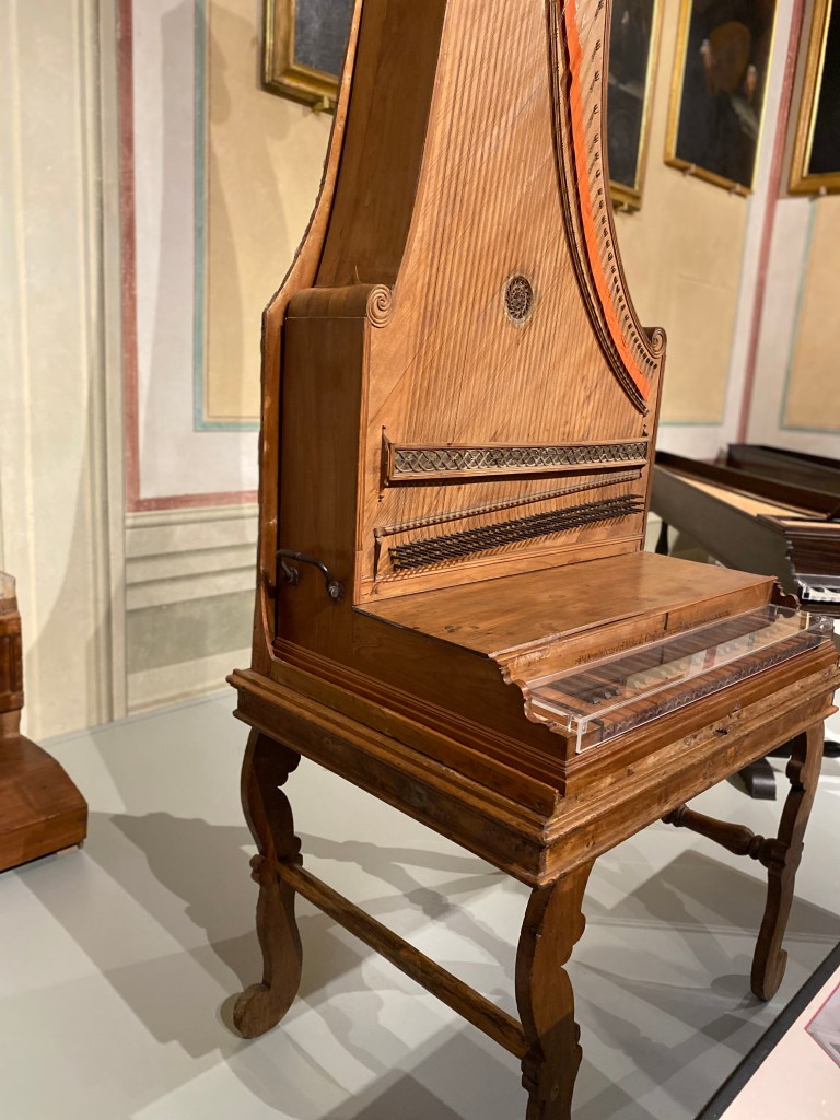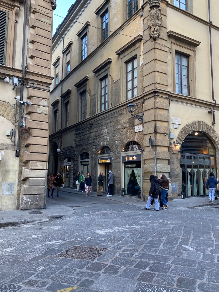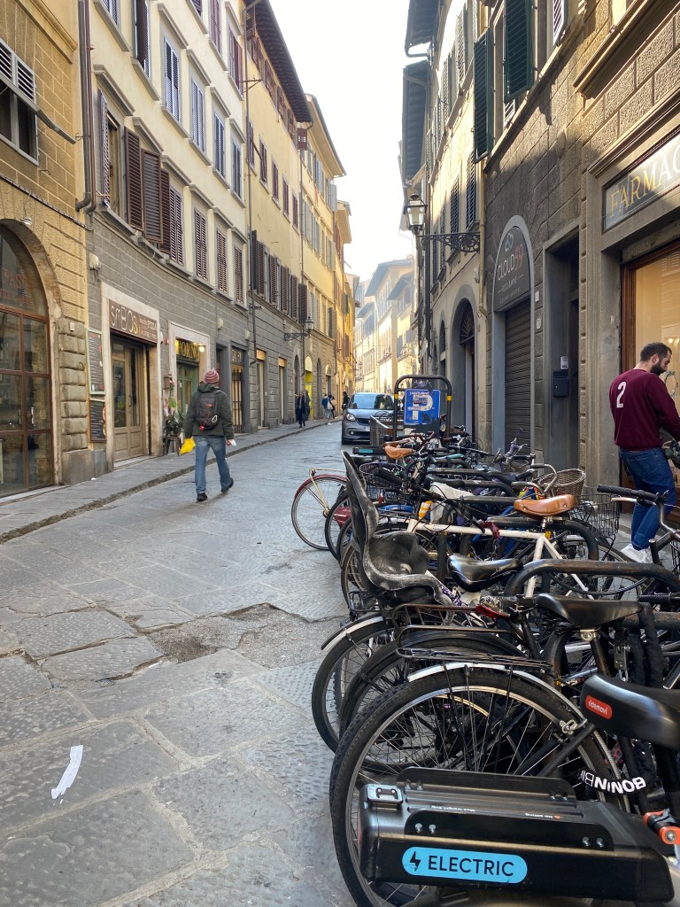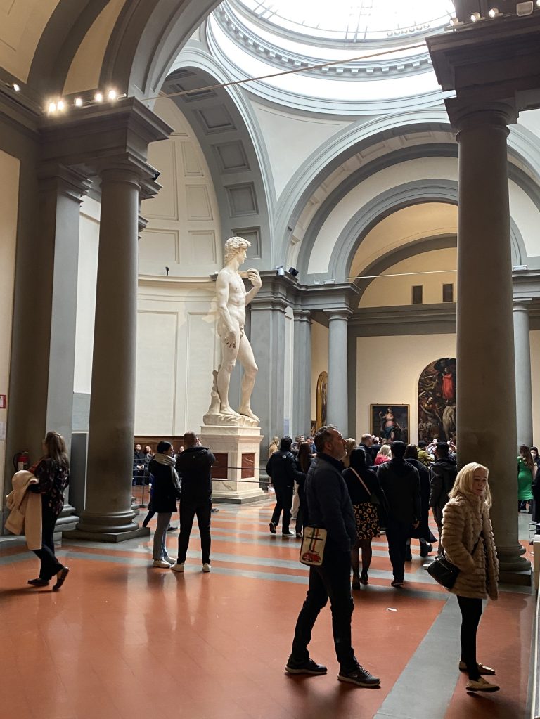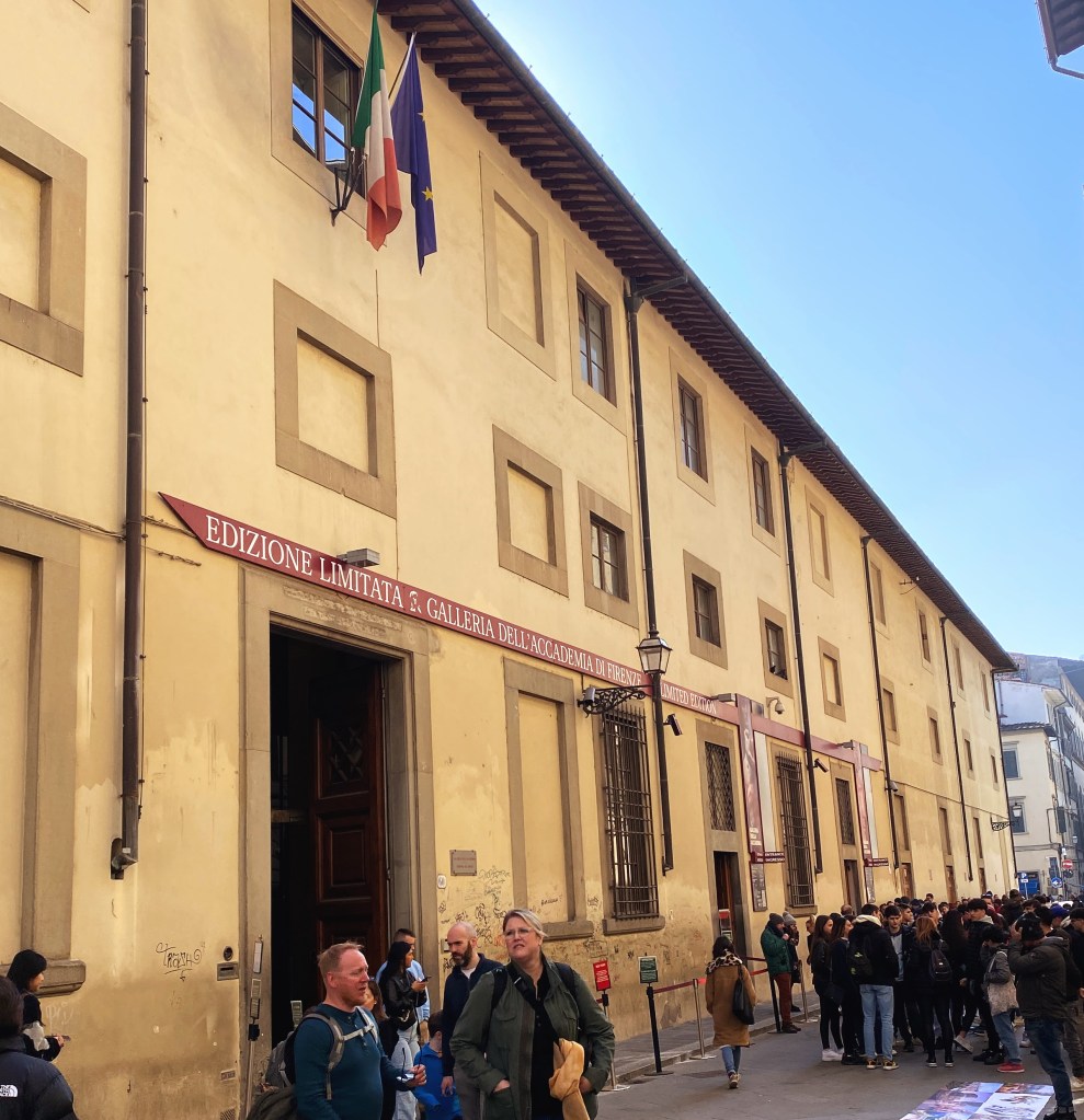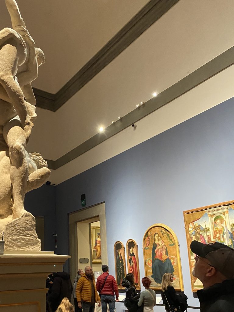 A stop at a local cafe recharges and sets us off to the most unassuming museum entrance in the world! Small touristy gift shops and bookstores line the narrow pedestrian street. While Randy secures our tickets I browse a few stores, a christian bookstore with Italian souvenirs and another bookstore with old hardbacks. One observation I have noticed in my travels is bookstores have the similar, familiar smell which I find grounding. Academy Galleria, contains Gothic paintings, musical instruments, David and other sculptures.