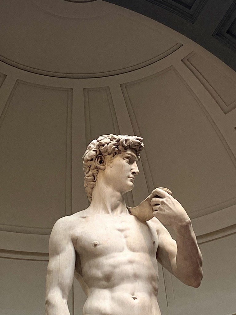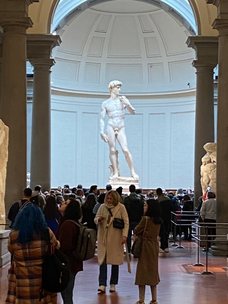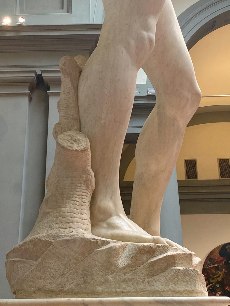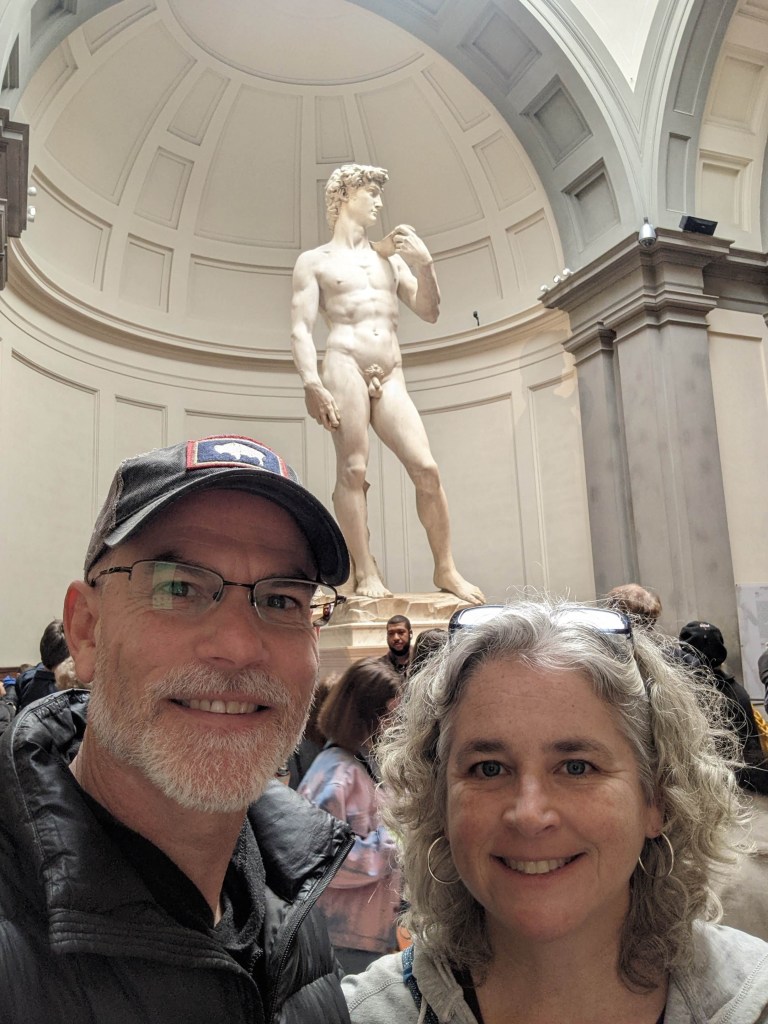 This is the moment Randy has envisioned for decades. He was a teen working in a peach orchard when he read The Agony and the Ecstasy by Irving Stone. Here we are in Florence going to see David. The book title depicts us today, me in daily agony with my ankle and Randy in ecstasy upon seeing the marble masterpiece of David. Despite never reading the novel I have researchable knowledge of Michelangelo, marble, and David.