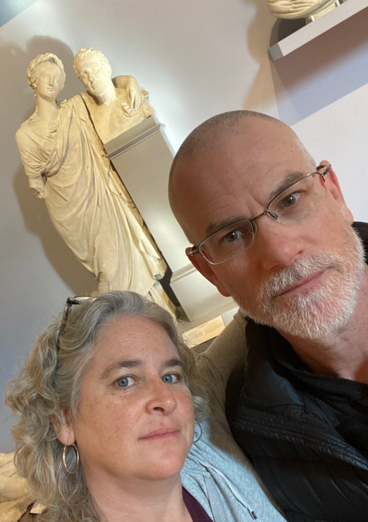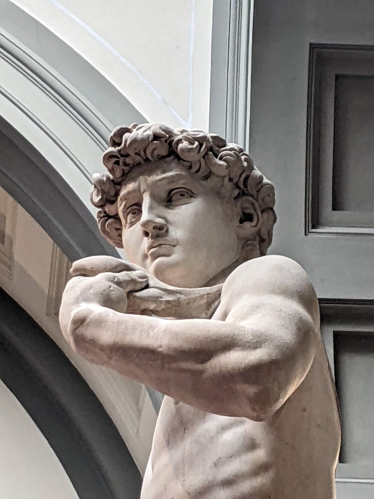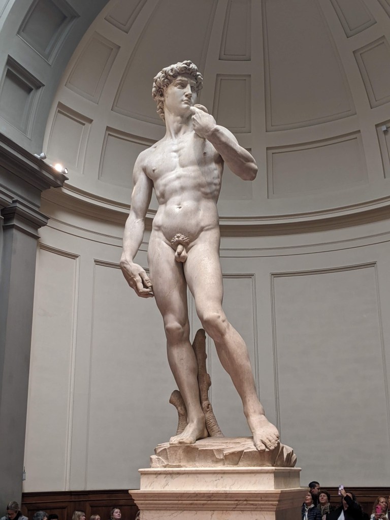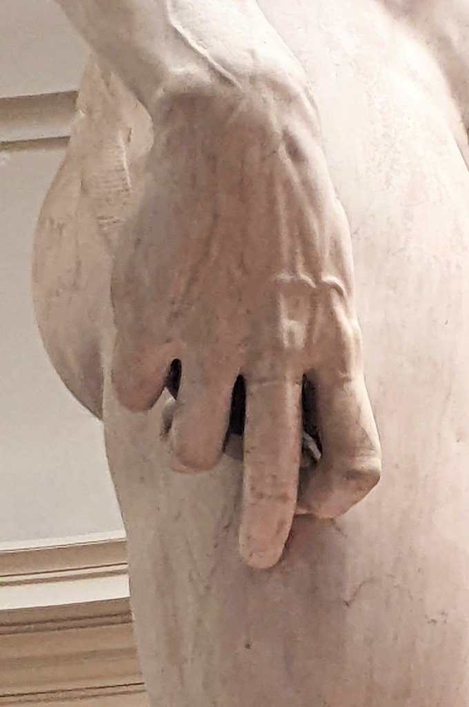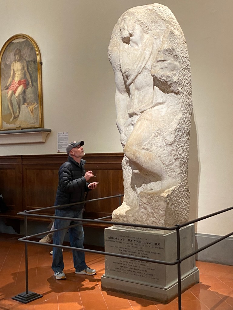 This is the moment Randy has envisioned for decades. He was a teen working in a peach orchard when he read The Agony and the Ecstasy by Irving Stone. Here we are in Florence going to see David. The book title depicts us today, me in daily agony with my ankle and Randy in ecstasy upon seeing the marble masterpiece of David. Despite never reading the novel I have researchable knowledge of Michelangelo, marble, and David.