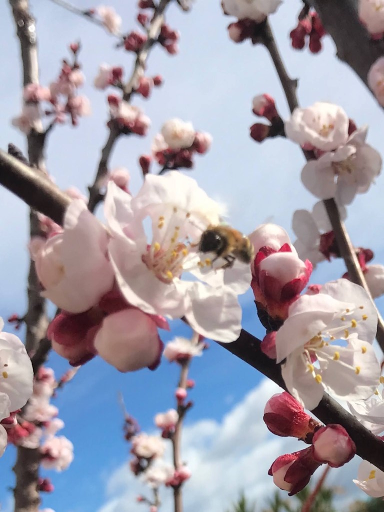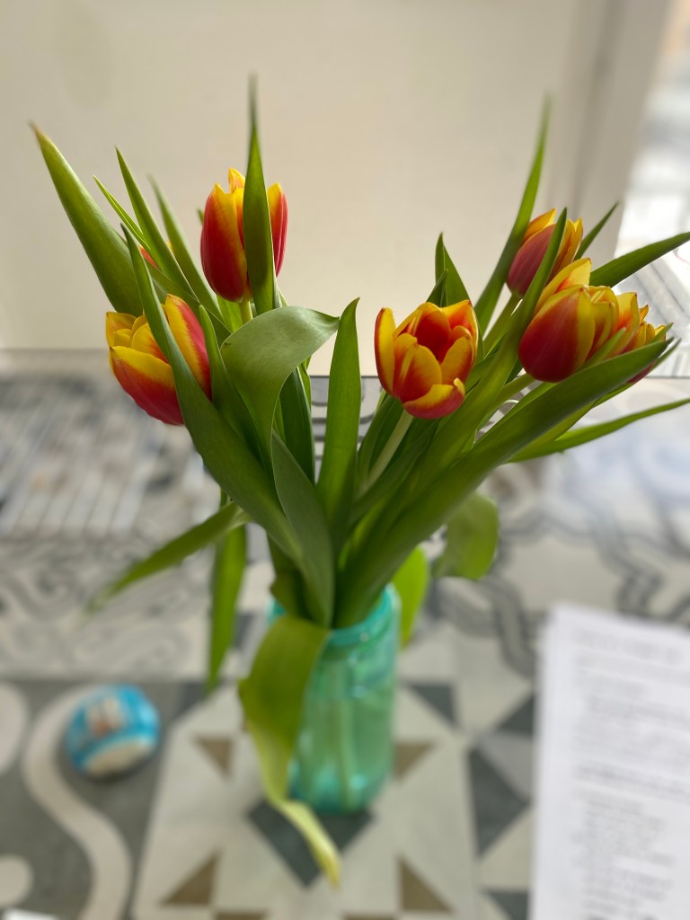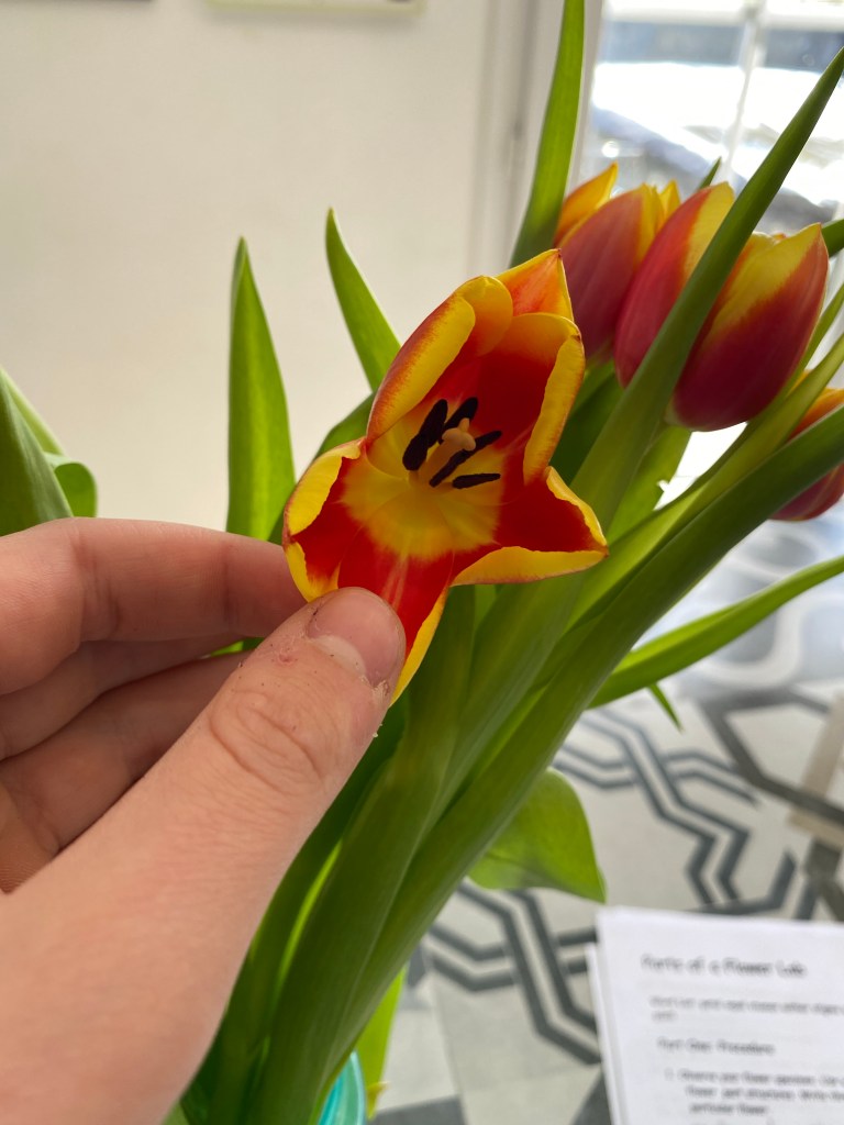 We were only gone a few days, yet we returned the trees budding and blooming. Flowers are starting to wake up and display their colors. Luckily tulips can be found at the store because we needed one for a flower dissection. I enjoy playing with the app Artisto with my Peter Rabbit gate.