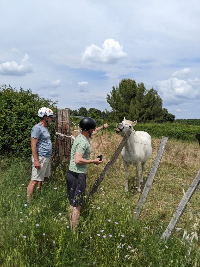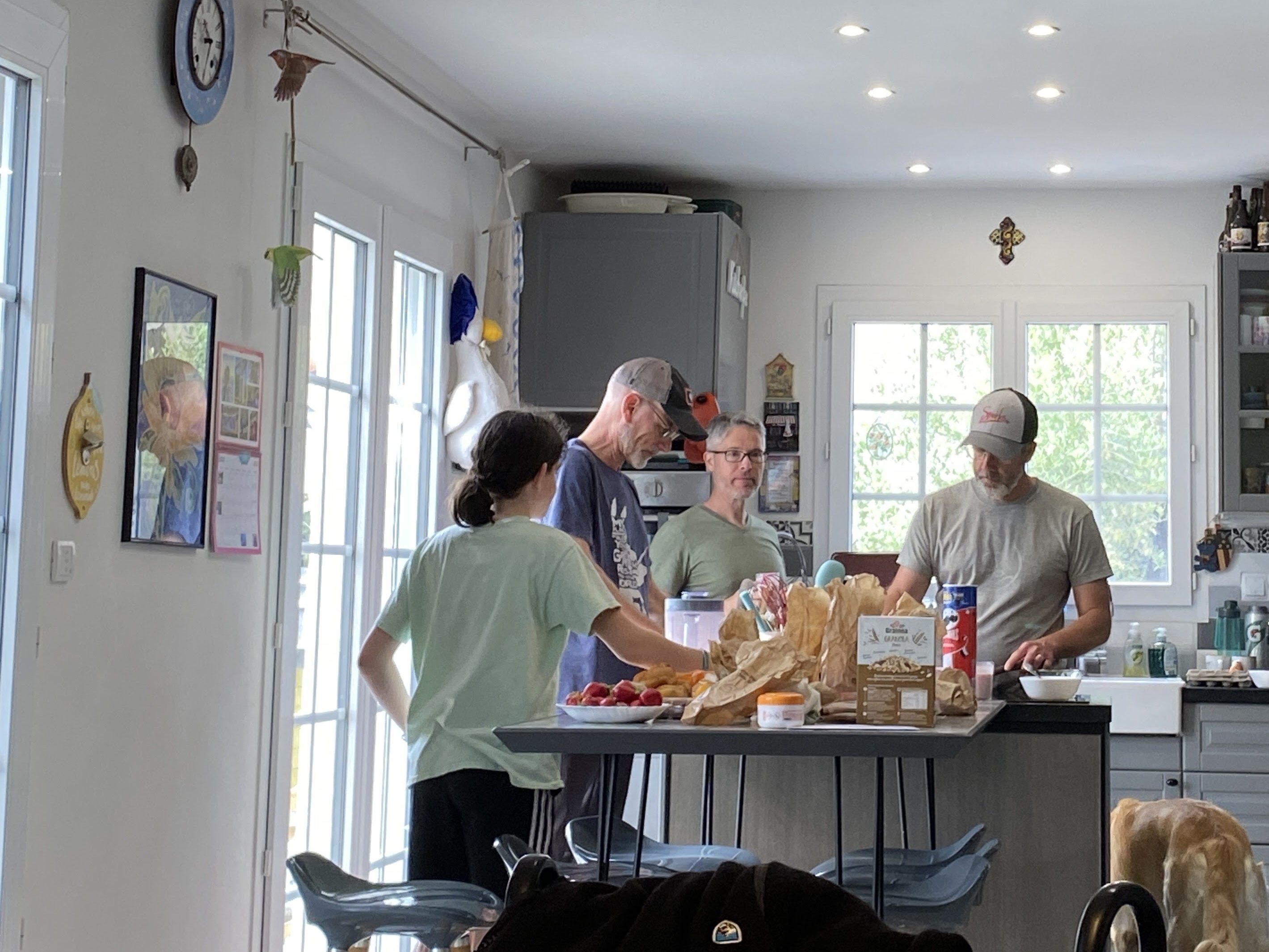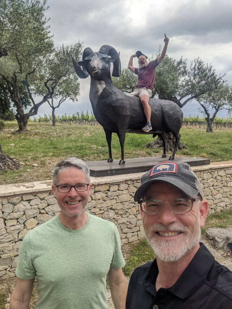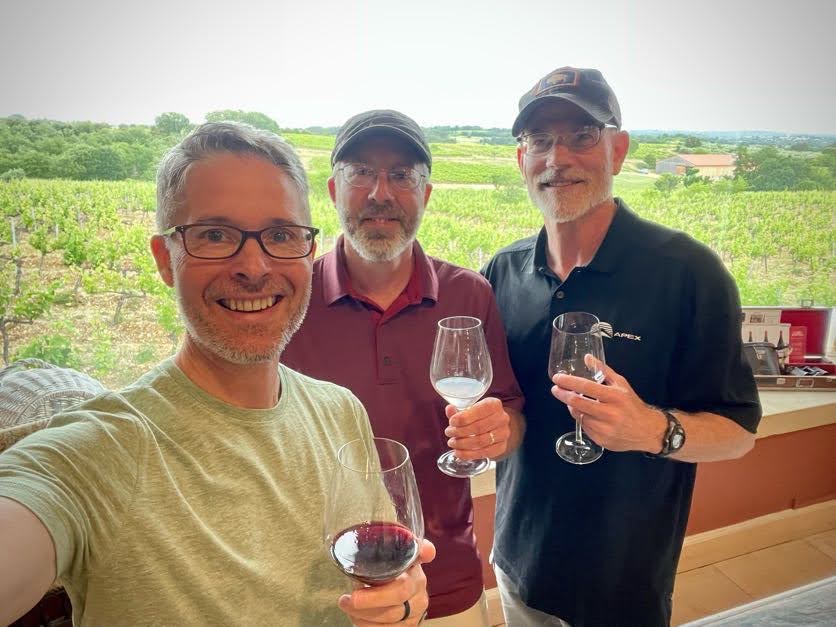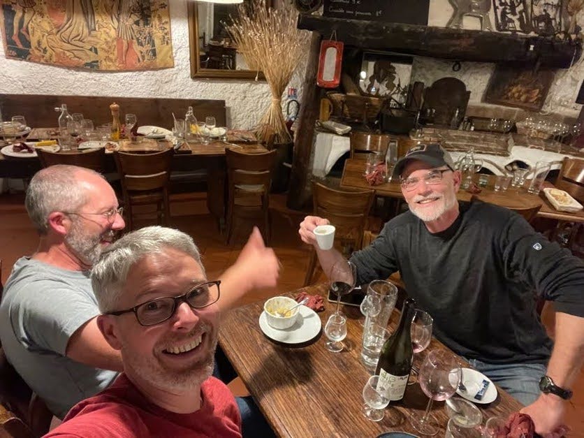 The guys spent several days biking the vineyards and countryside. Randy hiked them to our favorite castle ruin, found poppy fields, and ventured to another ruin. It has been at least 25 years of weekly “Wednesday Night Hangout” for these three college buddies. Not a bad way to celebrate this friendship by being in France and sharing beer and wine. We all enjoyed their conversations, company and English.