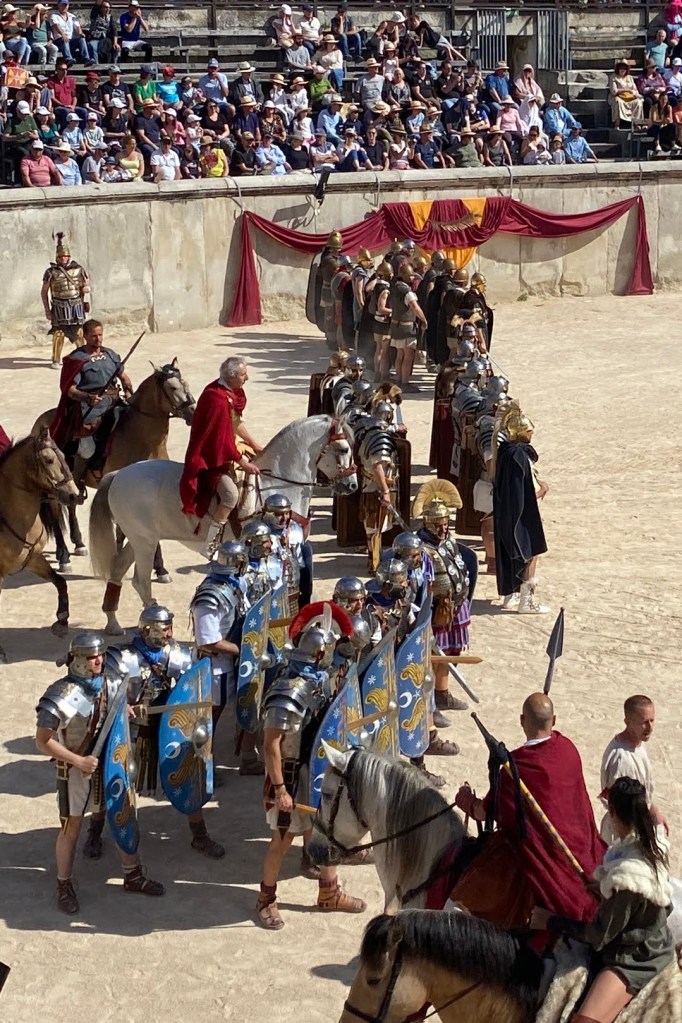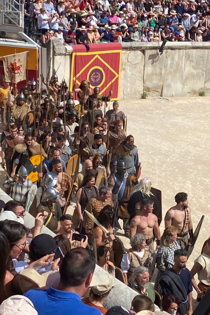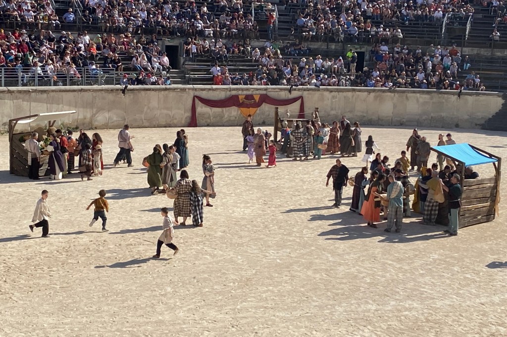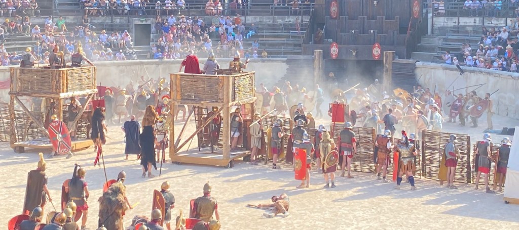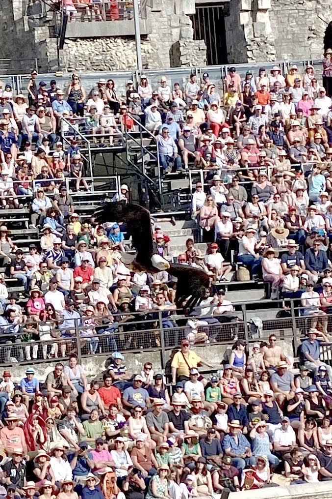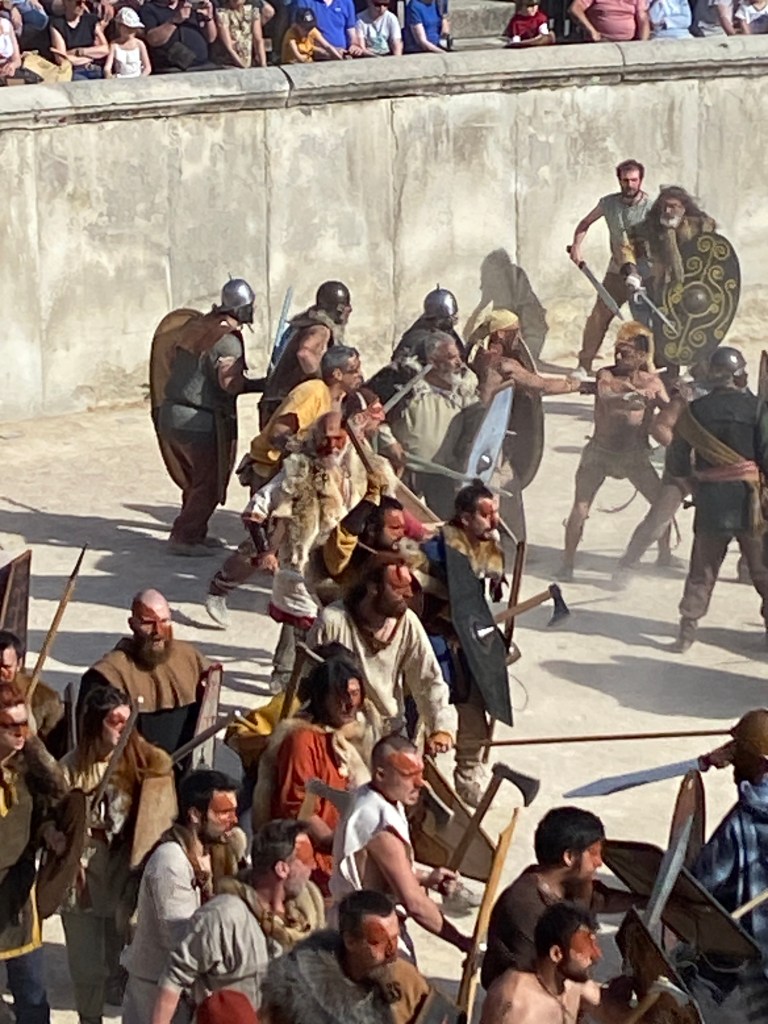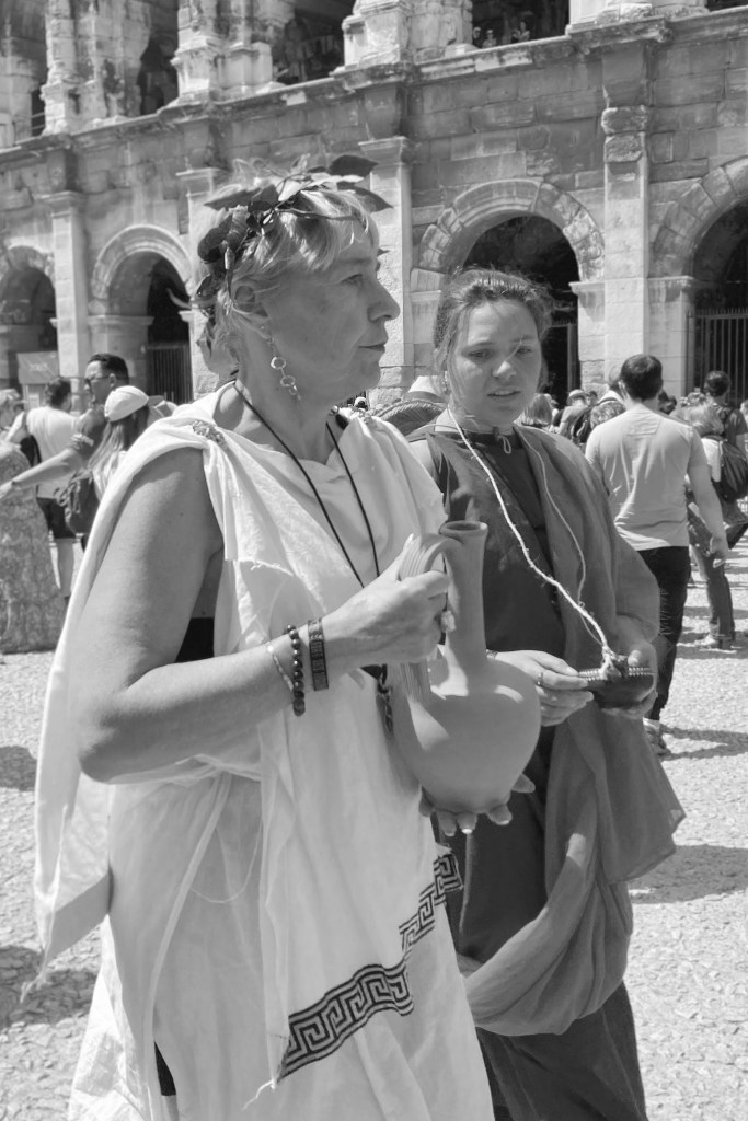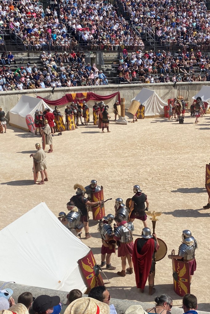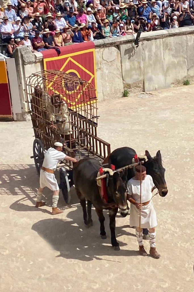 Touring a Roman coliseum was our last adventure for the day. Mazie and I had been in a coliseum in Nimes so we decided to visit another one nearby, in Arlés. The short drive there allowed our bodies to cool and rest. The traffic, directions and parking aspects in Arlés were crazy. We came in between the end of a work day and the beginning of a Wednesday night downtown festival! Finally, after round and round the town, we landed in a parking spot that was not in a last minute tow-zone. The coliseum was tucked in a fun little part of town with narrow streets and old French decor.