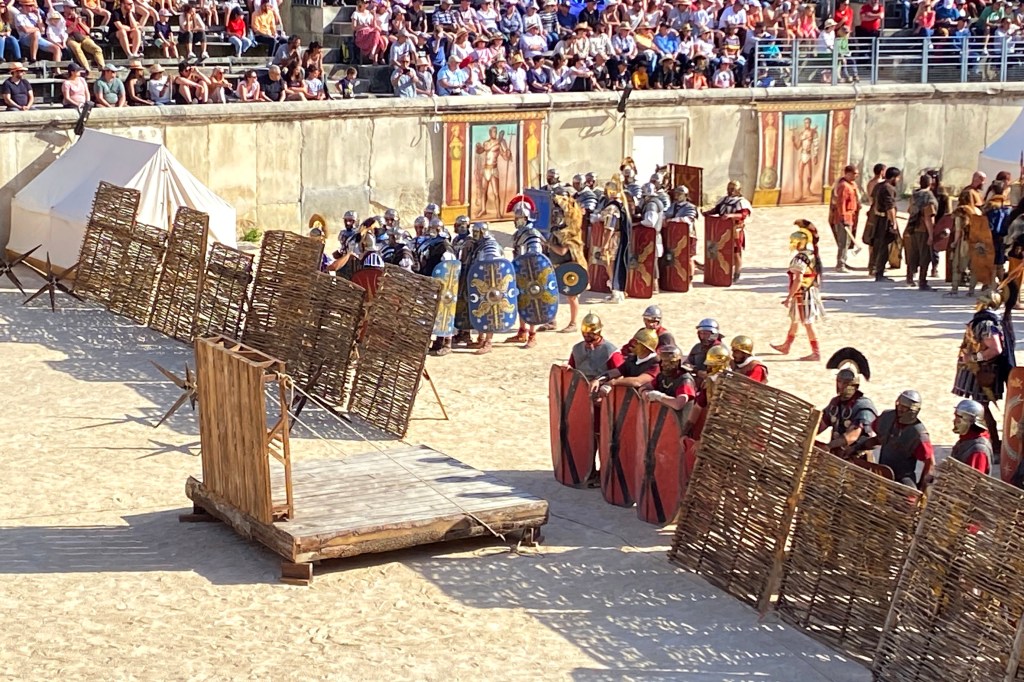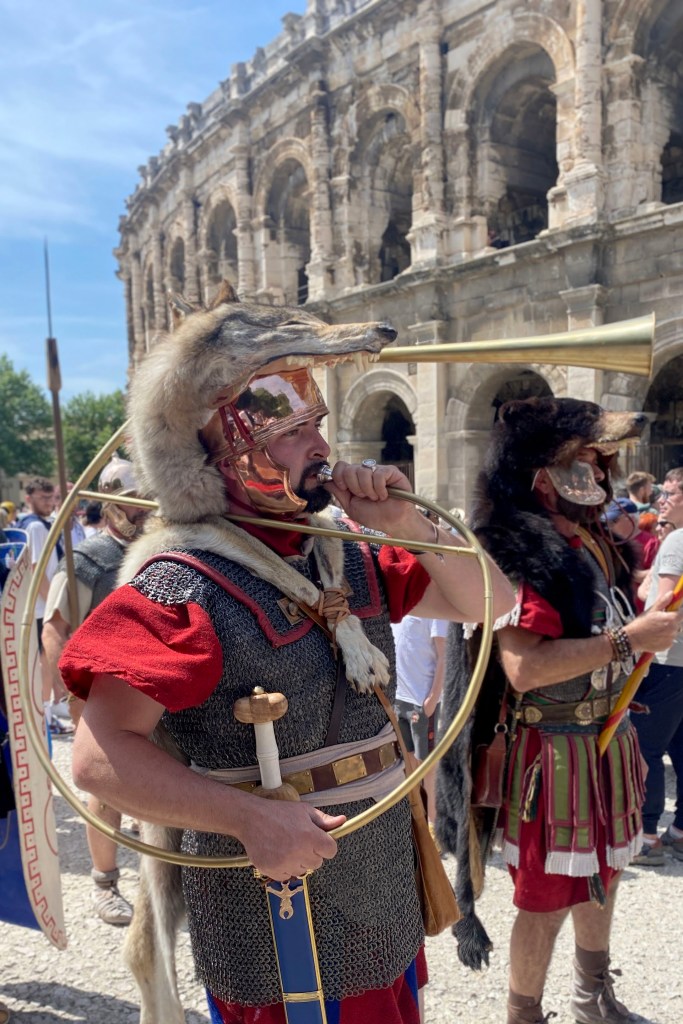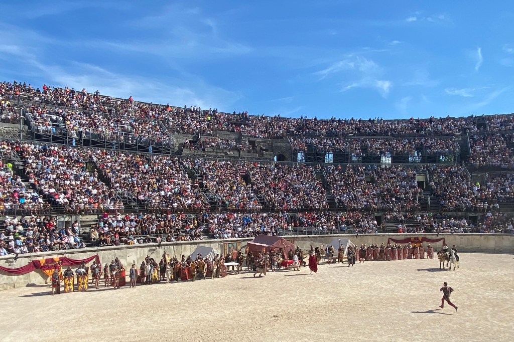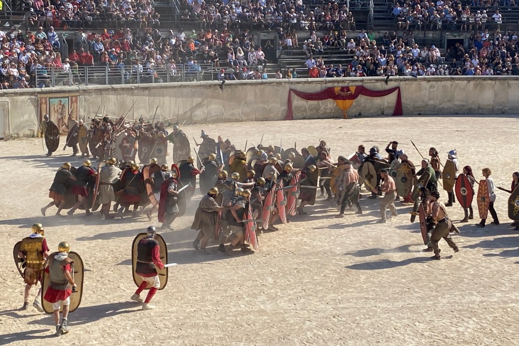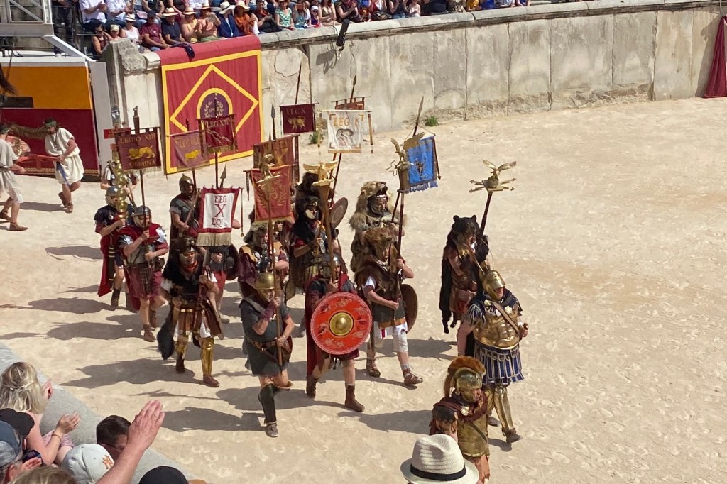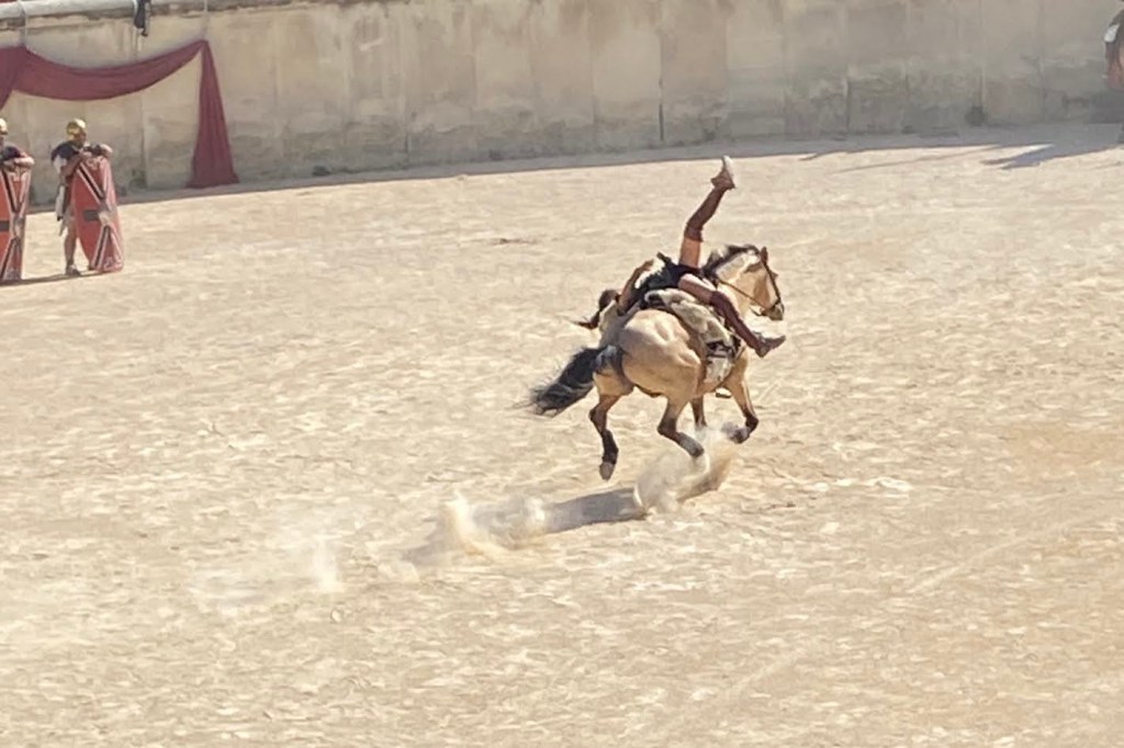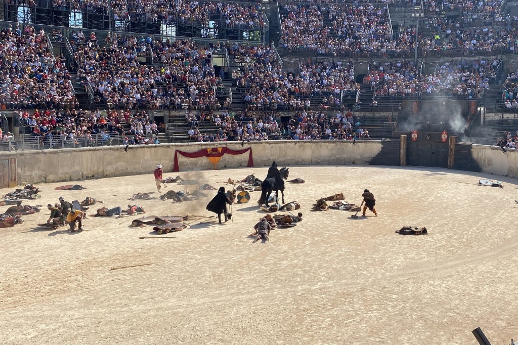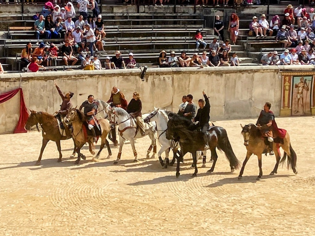 Touring a Roman coliseum was our last adventure for the day. Mazie and I had been in a coliseum in Nimes so we decided to visit another one nearby, in Arlés. The short drive there allowed our bodies to cool and rest. The traffic, directions and parking aspects in Arlés were crazy. We came in between the end of a work day and the beginning of a Wednesday night downtown festival! Finally, after round and round the town, we landed in a parking spot that was not in a last minute tow-zone. The coliseum was tucked in a fun little part of town with narrow streets and old French decor.