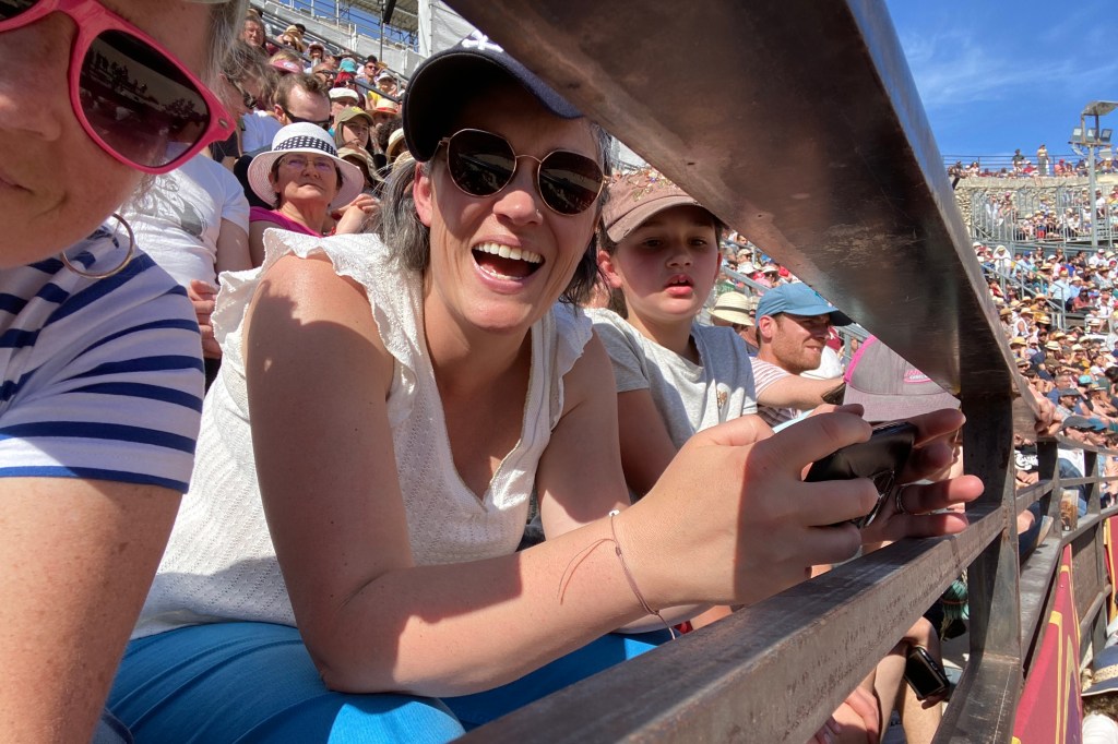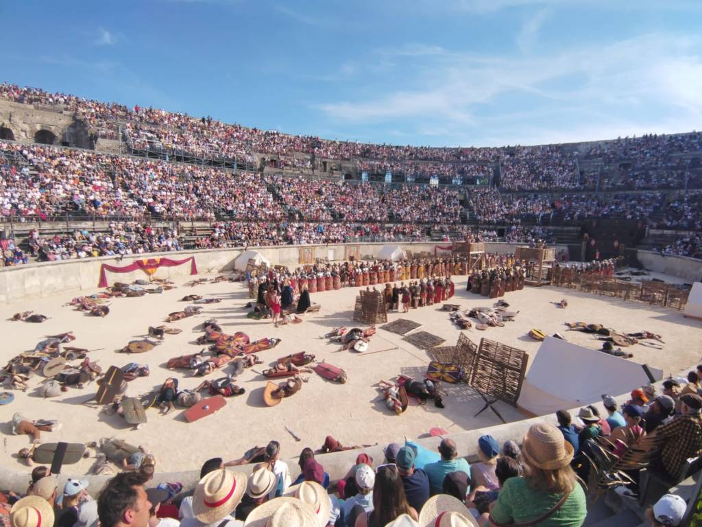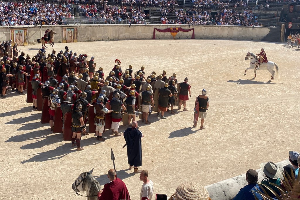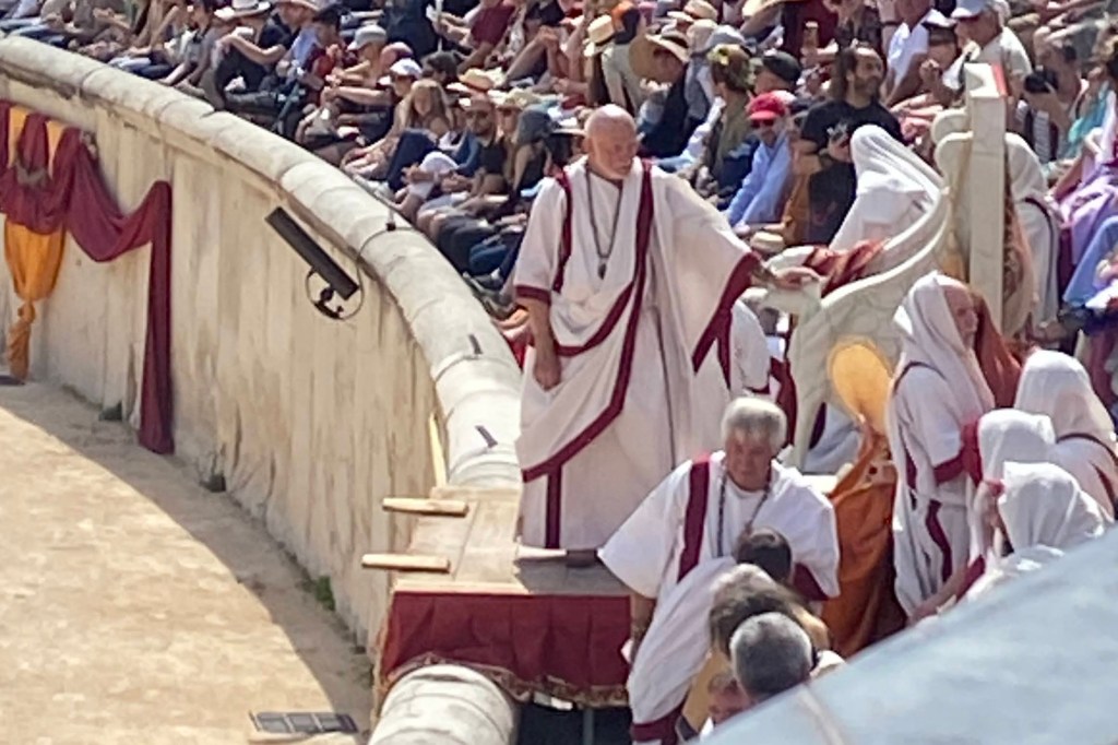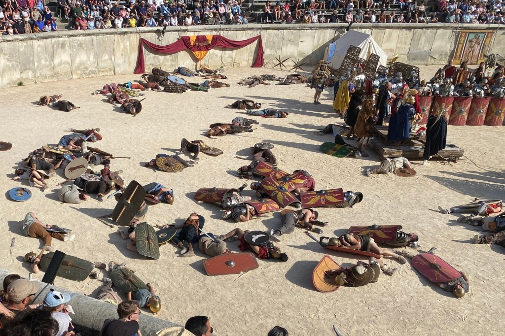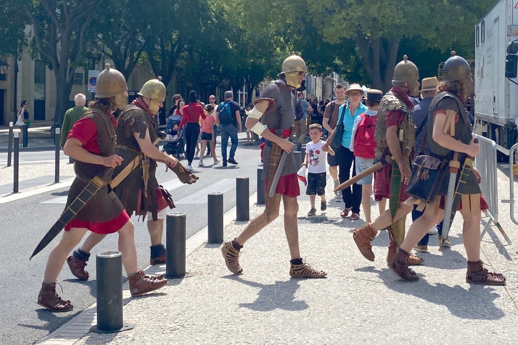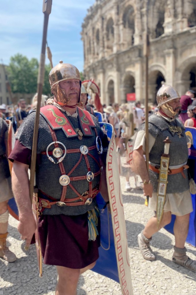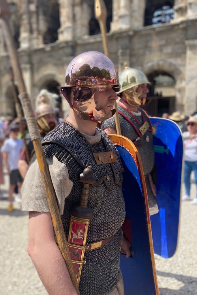Touring a Roman coliseum was our last adventure for the day. Mazie and I had been in a coliseum in Nimes so we decided to visit another one nearby, in Arlés. The short drive there allowed our bodies to cool and rest. The traffic, directions and parking aspects in Arlés were crazy. We came in between the end of a work day and the beginning of a Wednesday night downtown festival! Finally, after round and round the town, we landed in a parking spot that was not in a last minute tow-zone. The coliseum was tucked in a fun little part of town with narrow streets and old French decor.